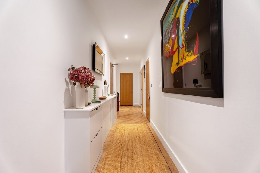 The entrance hall gives a glimpse of the high standard of finishings on offer in this spectacular apartment, with beautiful, Amtico muted Oak Herringbone flooring flowing seamlessly into the large open plan living room and kitchen and throughout.