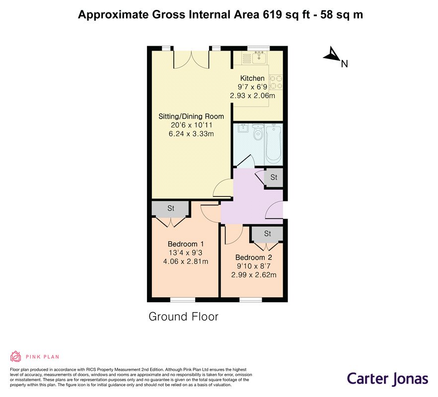 A well laid out, two bedroom, ground floor apartment. The front door opens into the entrance hall with doors off to all rooms. The open plan sitting/kitchen/dining room is particularly light and airy, with French doors from the sitting area opening onto the grassy area outside to the rear of the block. Both bedrooms also have inbuilt storage space.