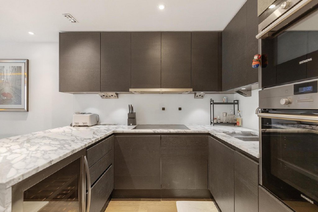 The heart of the home is the expansive reception room and open-plan kitchen, stretching nearly 29ft in width. Floor-to-ceiling windows flood the space with natural light and open directly onto a private balcony, ideal for entertaining or enjoying views over the surrounding area. The kitchen itself is sleek and modern, featuring integrated appliances and excellent workspace.