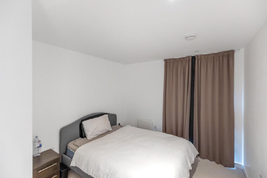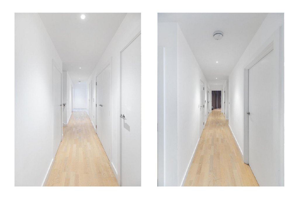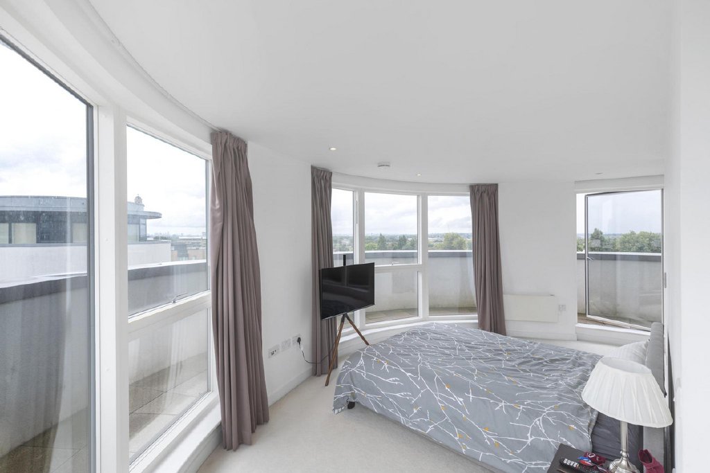 Occupying the 7th and 8th floors, this 1,391 sq ft residence is defined by its striking circular architecture and abundance of natural light. The impressive open-plan kitchen, dining, and reception space is framed by panoramic curved windows, creating a stunning backdrop for both everyday living and entertaining. From here, doors open onto a private wrap-around balcony, perfect for enjoying elevated views across Brentford and the City of London.