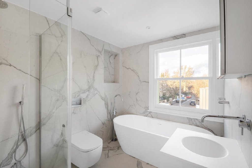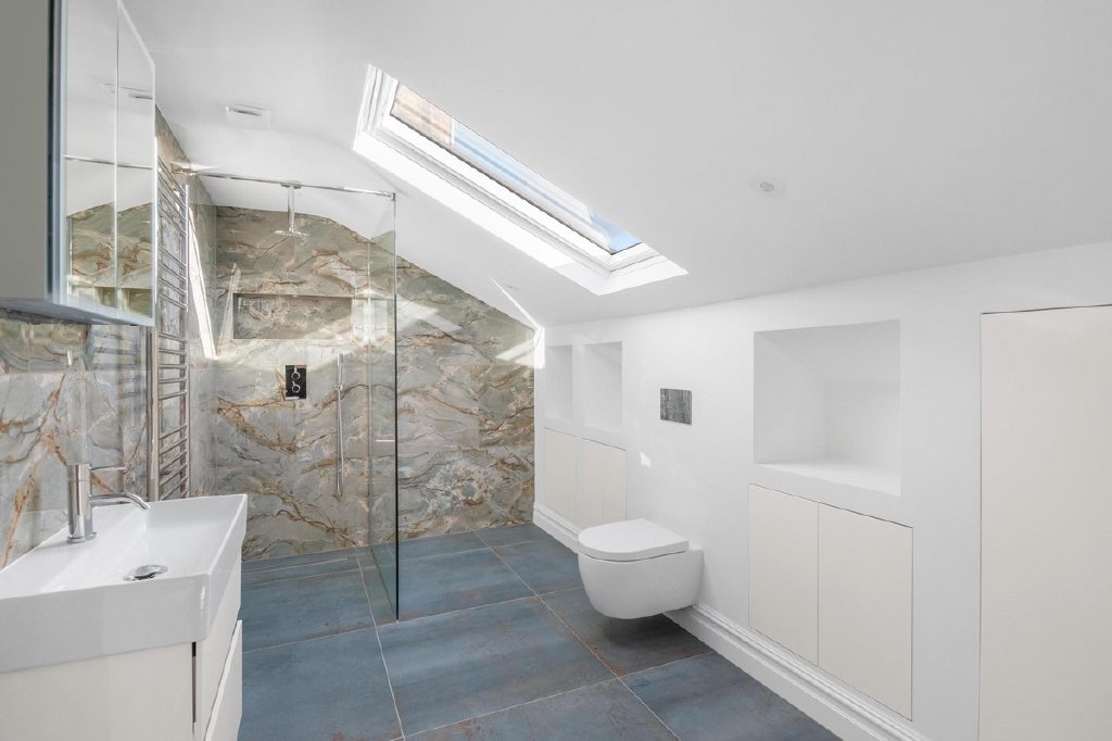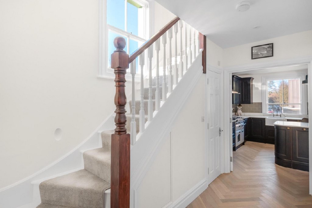 Meticulously restored to its former glory, the property seamlessly blends historic charm with contemporary design. The current owner has revived many of Barry Bucknell’s original features while incorporating modern touches. The heart of the home is a spacious, open-plan living area complemented by a sleek, fully equipped modern kitchen—perfect for entertaining or relaxing with family. Upstairs, three generously sized bedrooms are paired with three luxury bathrooms, ensuring comfort and privacy across the first and second floors.