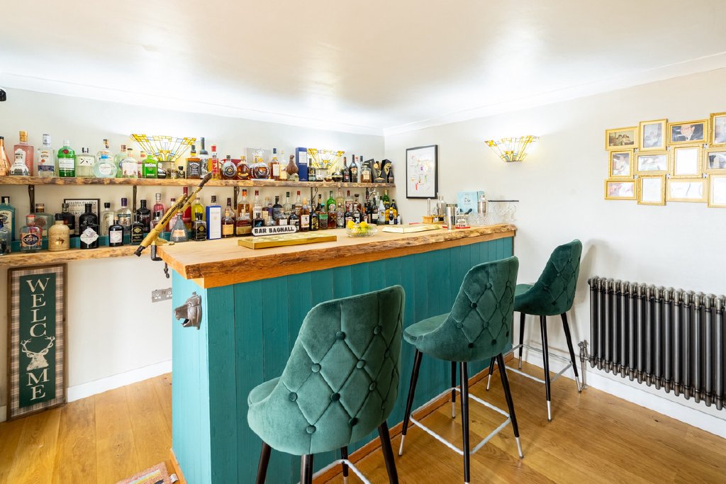Waney oak bespoke shelving and bar, a reproduction pewter fireplace, and oak flooring set the scene for sophisticated entertainment. This space flows seamlessly into the double-height family room, a breathtaking venue for gatherings with family and friends.