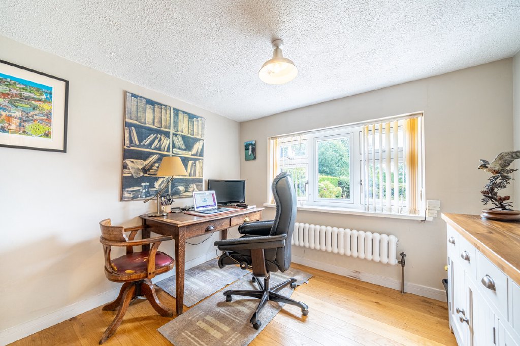 The traditional family room, with French doors to the patio, features a stunning Inglenook fireplace with HETA log burner and slate surround. A study with oak flooring and a rear hall with bespoke cloakroom storage complete the interior spaces.