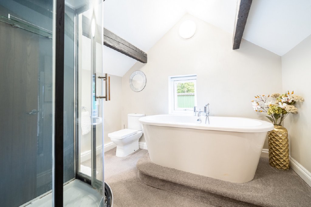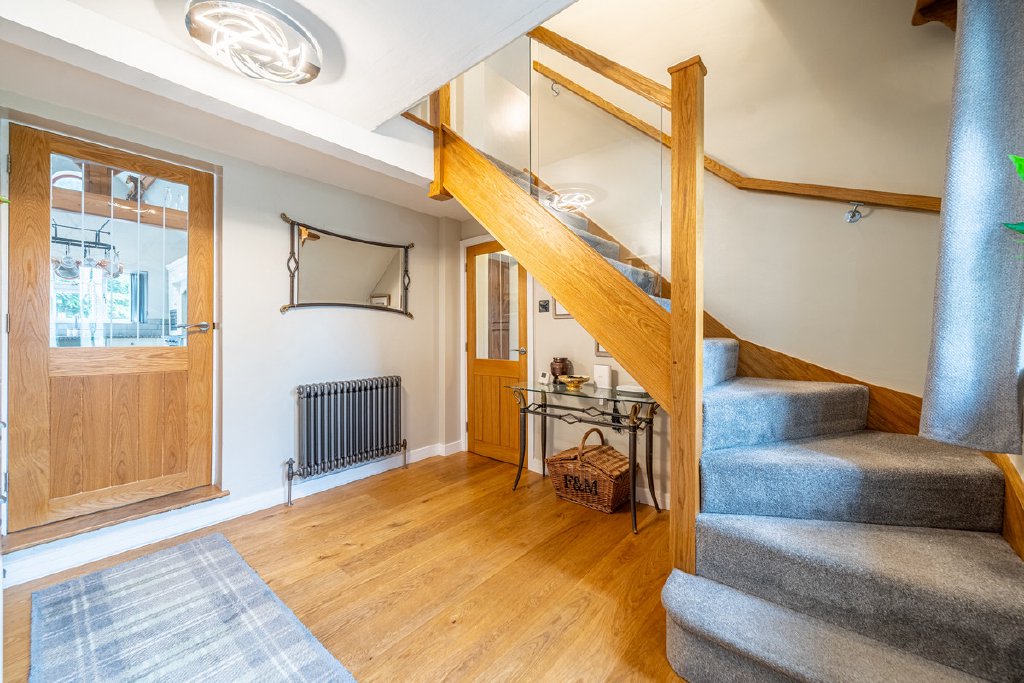 Brow Nook Farm is a beautiful traditional Staffordshire long cottage that has been lovingly renovated and thoughtfully extended. The entrance hall, with its elegant tiled flooring, leads to an oak-and-glass staircase and spacious hallways adorned with oak flooring and thermostatically controlled iron-cast radiators.