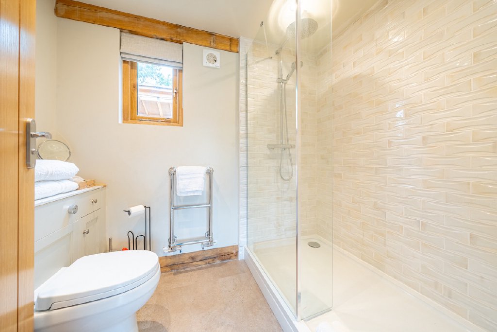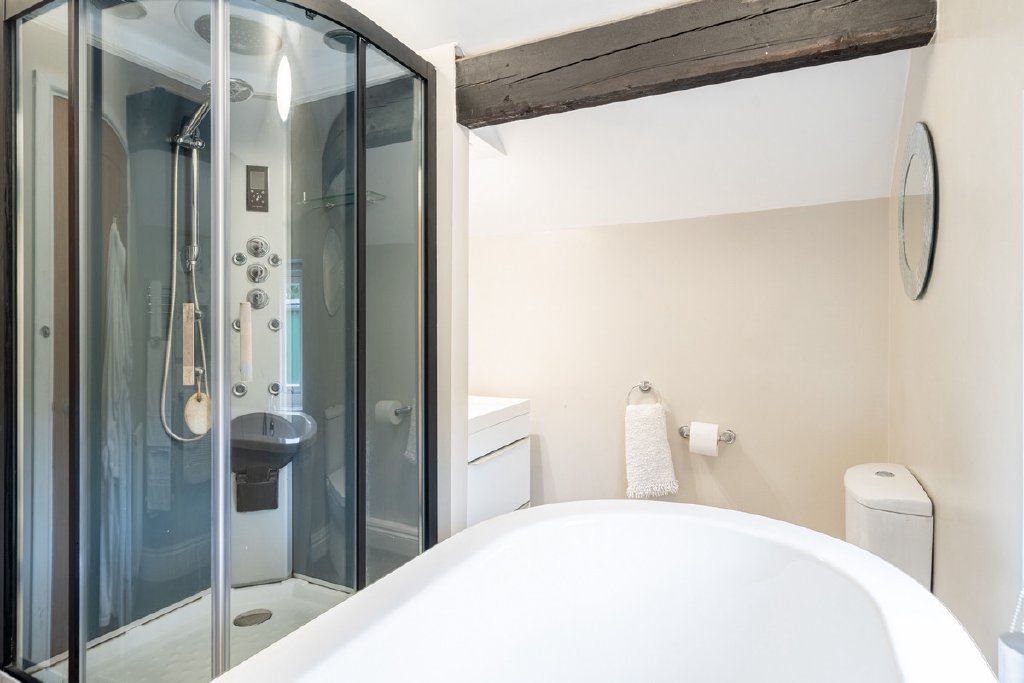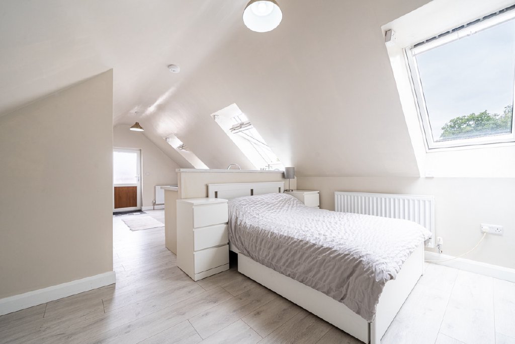 Flooded with natural light through Velux windows, this contemporary space offers laminated flooring, integrated appliances, a walk-in shower, sink, toilet, and generous storage.