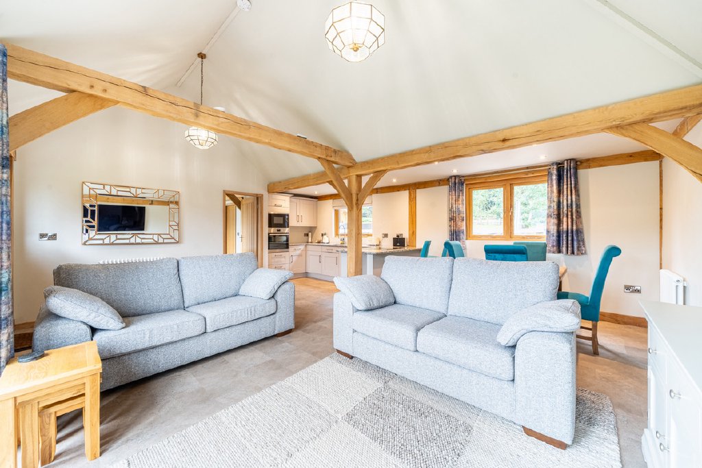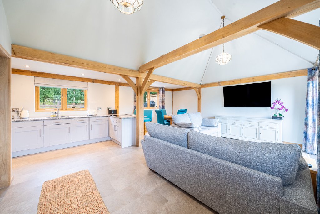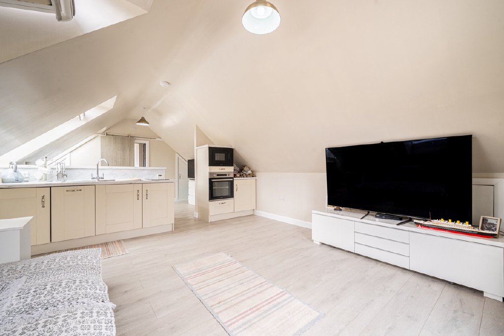 Double-height ceilings with exposed beams open to a kitchen with AEG fully integrated appliances and bespoke lighting. Karndean flooring runs throughout, and the bedroom features an ensuite shower and dressing room.