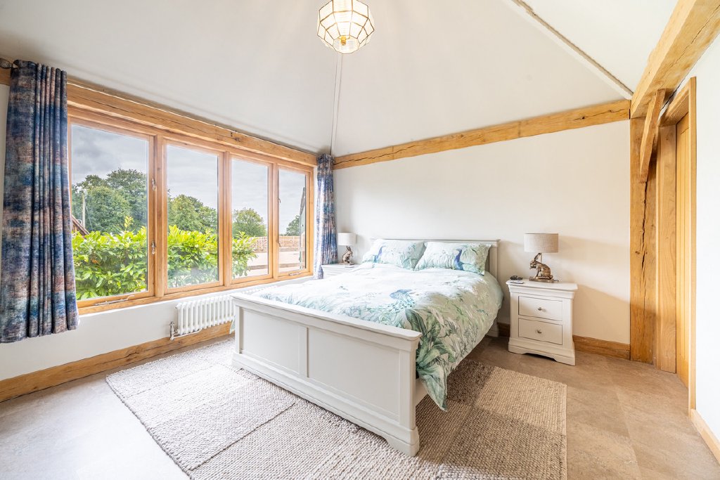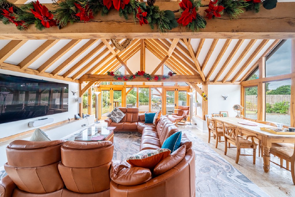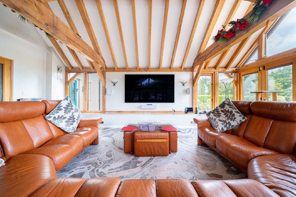 The spectacular oak-framed double-height extension features travertine marble flooring, underfloor heating, and air conditioning. Full-length glazing frames stunning countryside views, while two sets of French doors open onto a south-west facing patio and decking, perfect for alfresco entertaining. Control 4 automation and 5D surround sound complement bespoke Sanderson blinds and an ariel point, while a cosy fireplace provides a welcoming centerpiece for the adjoining dining space.