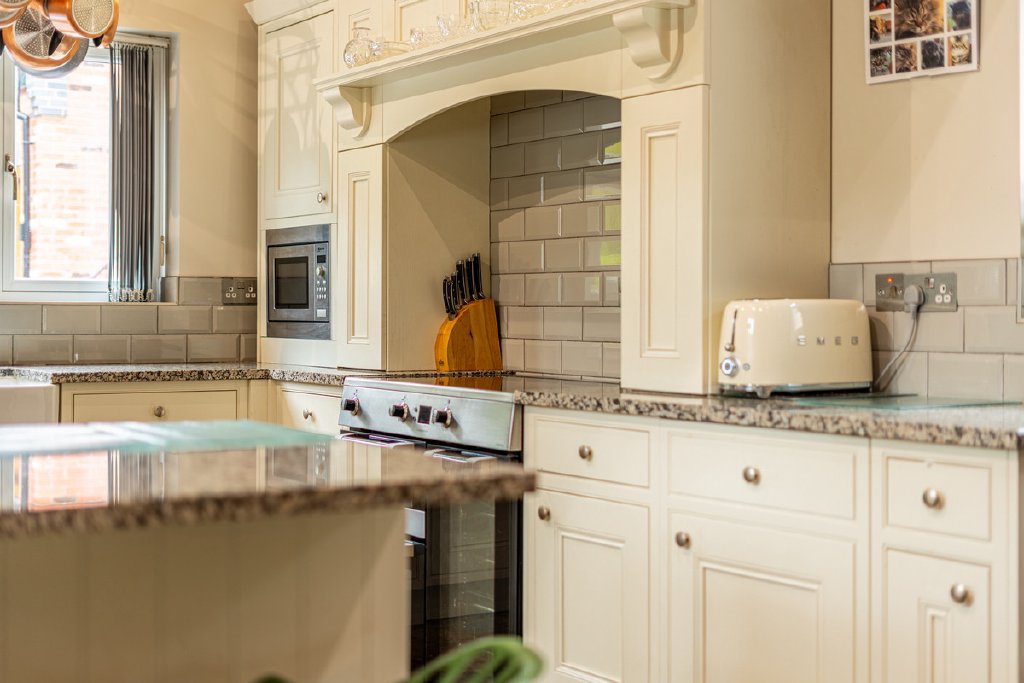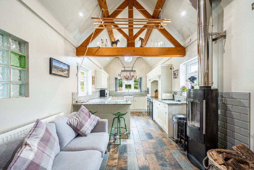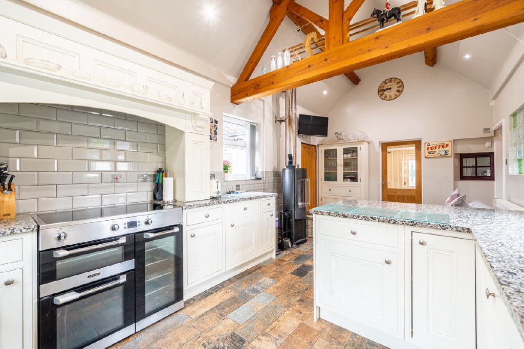 - Bespoke kitchen featuring a Drooff wood burning stove and high end integrated appliances