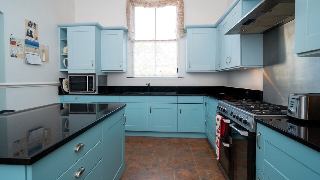 The kitchen continues this theme of light and connection, with generous proportions that make cooking and dining a joy, whether shared with family or enjoyed alone. From here, the views extend towards the landscaped grounds, so even daily routines feel elevated by the setting.