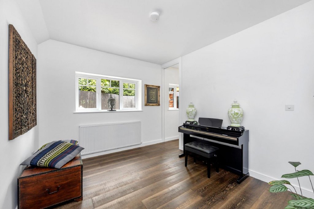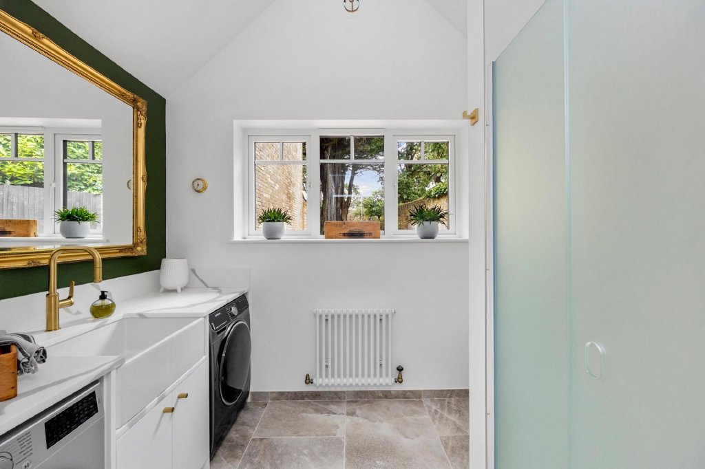 To the front is a second reception room, currently occupied as a snug but could equally be used as a third bedroom, is again decorated in an immaculate shade of white. Adjacent is an invaluable utility room and ground floor shower room with a full-sized Belfast sink, plumbing for a washing machine and separate dryer, ample countertop space, and a contemporary walk-in shower and w/c.