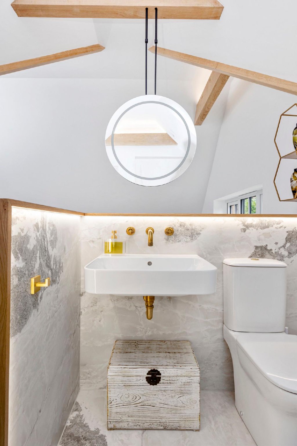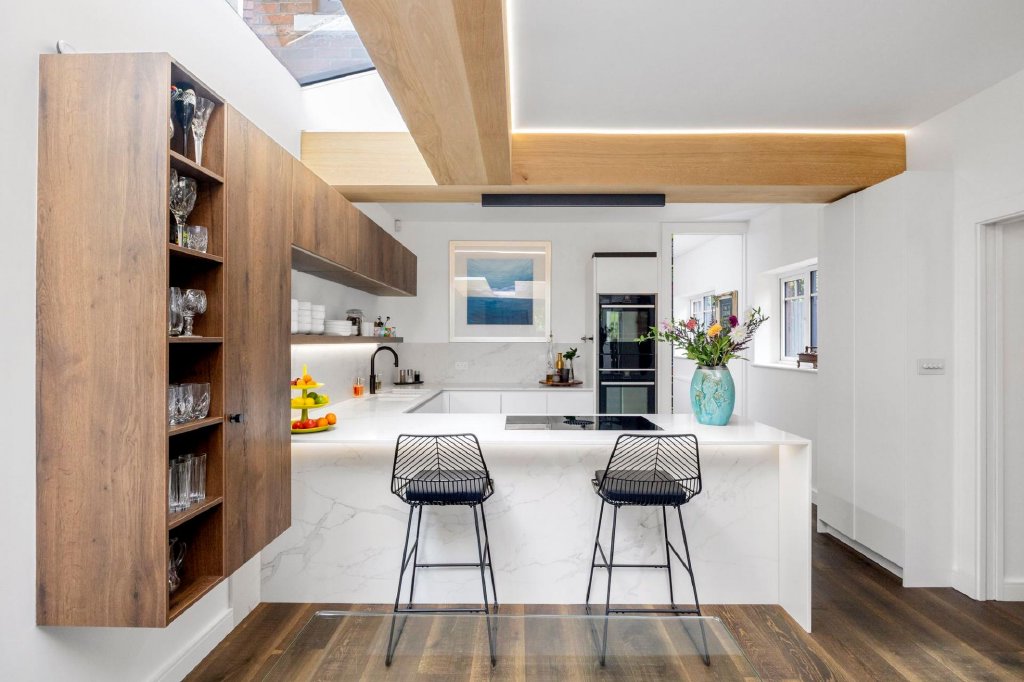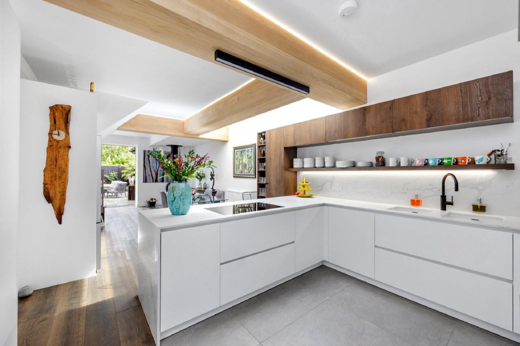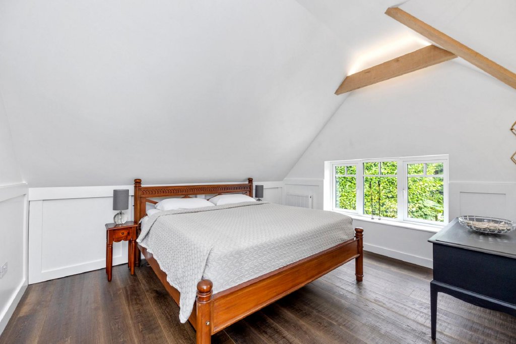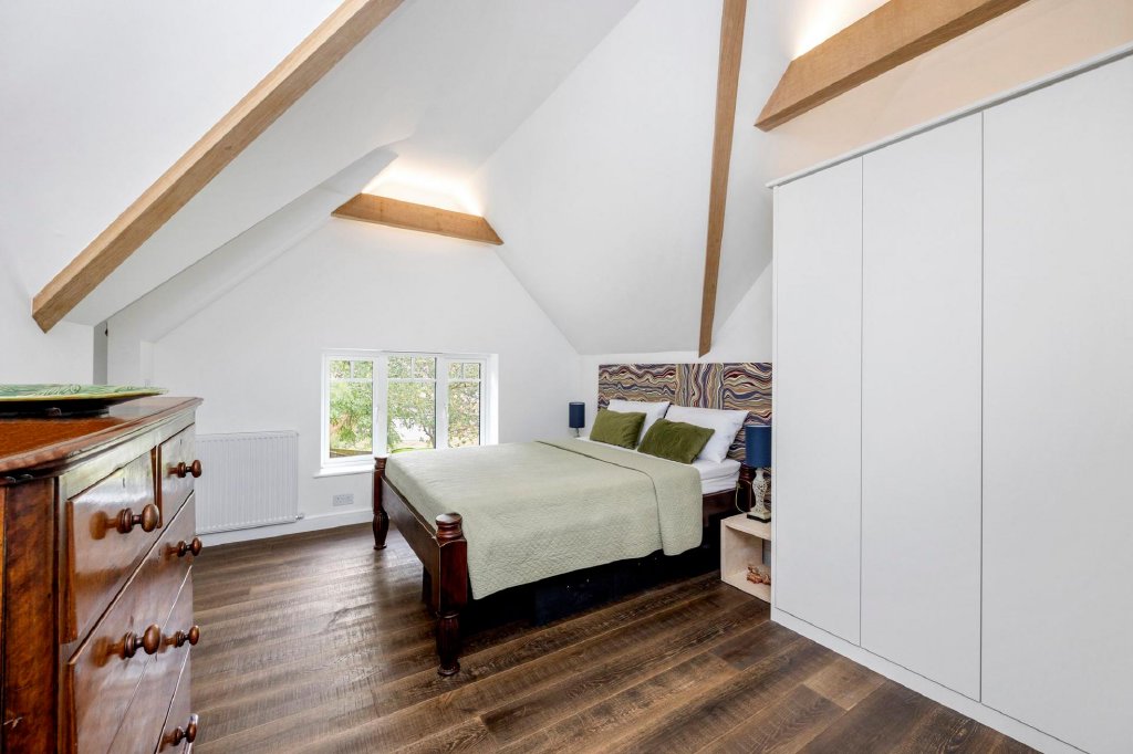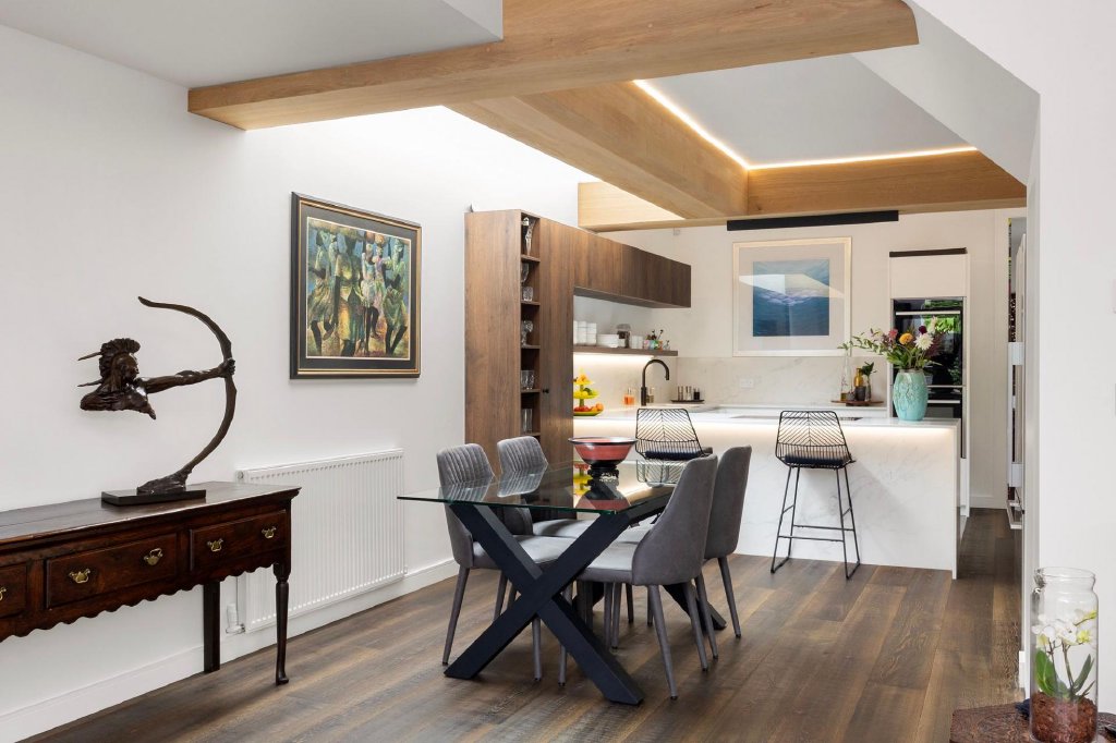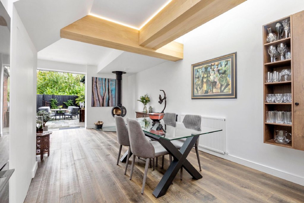 Natural materials feature prominently in the decor of this elegant home; a marble splashback, engineered wood flooring and dual aspect windows and sliding doors truly celebrate the outdoors. Whilst the most remarkable oak beams sit neatly overhead cleverly using concealed lighting to create an inherently tranquil setting.