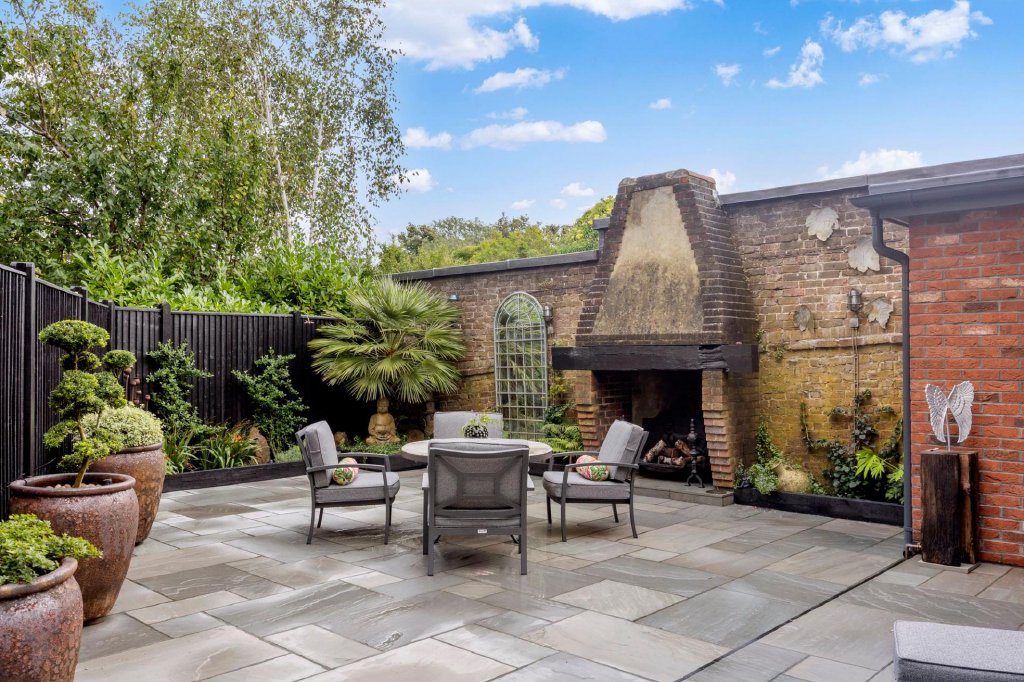 An elegant rear patio garden is beautifully set out in front of a remarkable period fireplace and chimney breast; in short, an idyllic spot for entertaining or relaxing no matter the season.