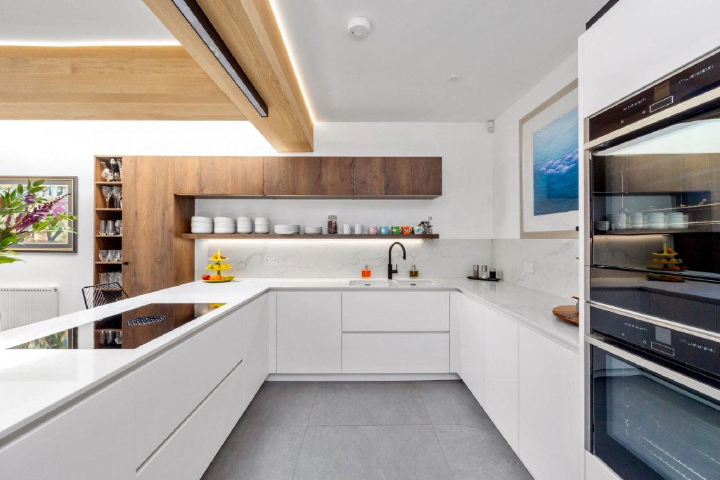 A range of integrated appliances include: a Fisher and Paykel fridge freezer, two identical Neff ovens with a warming drawer, a Quooker hot tap and a Bora induction hob with a highly effective under-floor extractor system.