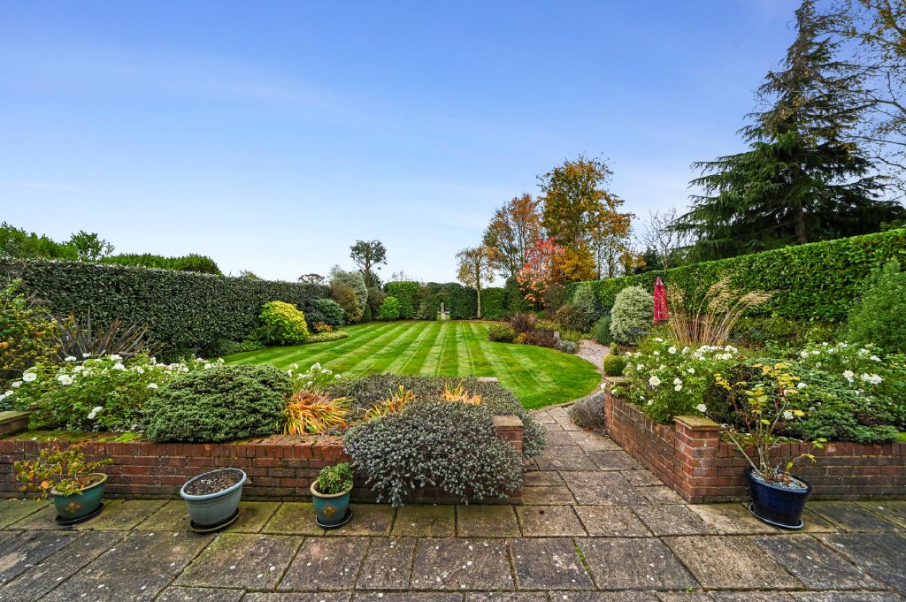 The walkway opens into an extensively paved patio arranged with decorative low-level walls filled with mature shrubs, roses and ground-covering plants. Twin walkways gently lead down to a pebbled path which borders one edge of the formal lawn. The entire garden feels secluded and beautifully landscaped, enclosed by fencing and hedging with an abundance of mature trees, shrubs and herbaceous borders that create colour and texture throughout the year.