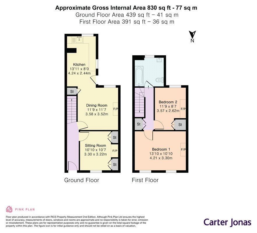 The ground floor comprises an entrance hall, a sitting room to the front, a second reception room to the rear, and a spacious kitchen/breakfast room. On the first floor there are two good sized double bedrooms and a well-proportioned family bathroom