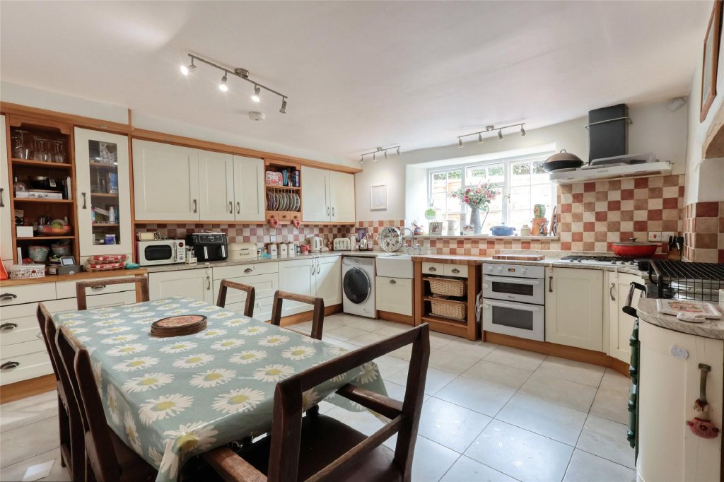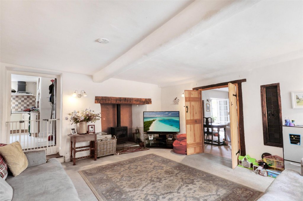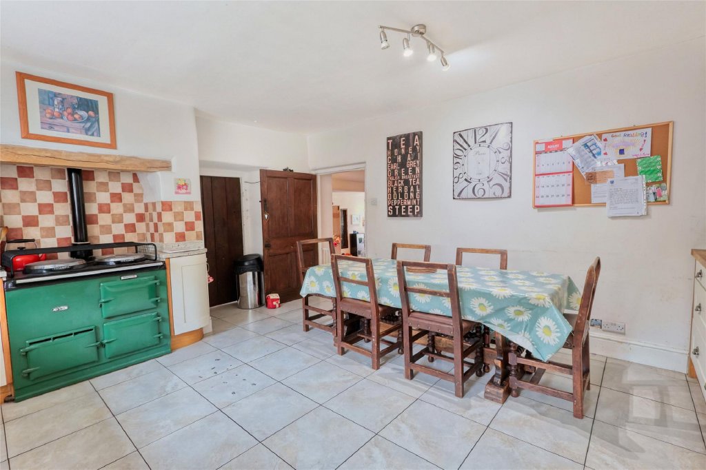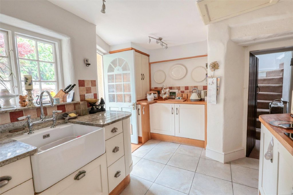 Approached through a timber pedestrian gate into a part-walled front garden, the original canopy porch and stable door invite you into an entrance lobby and Inside, you’ll find a wealth of character features. The sitting room is a charming room with fireplace and woodburner on a slate heart with double doors into a separate dining/family room again with fireplace and woodburner on a slate hearth, built in dresser and window seat. A third reception room with exposed stonework and beams makes an ideal study.