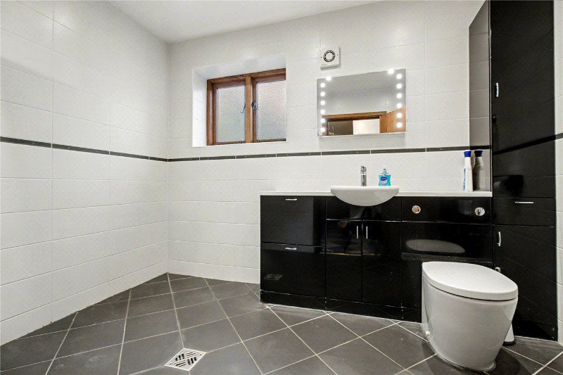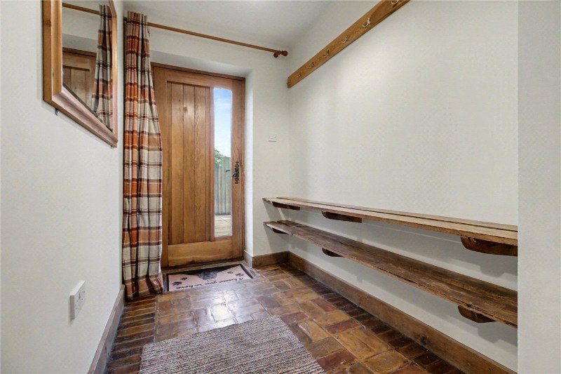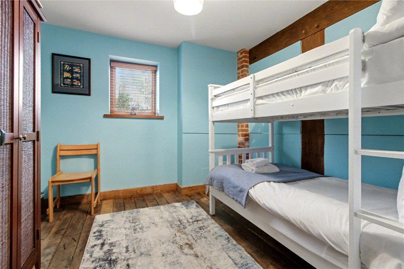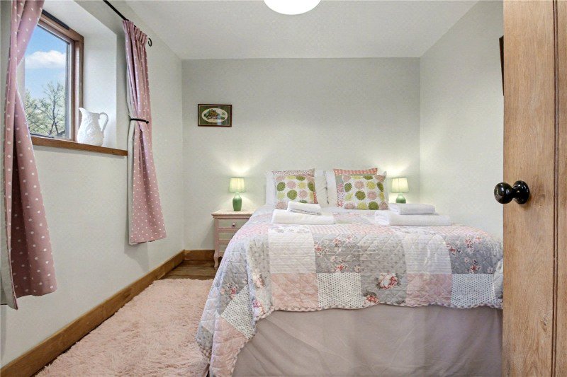 Upstairs, the principal bedroom impresses with a wall of floor-to-ceiling windows framing far-reaching countryside views, bespoke wardrobes, and a beautifully appointed en-suite shower room. Three further double bedrooms and a delightful family bathroom complete the first floor, the latter featuring a freestanding clawfoot bath and traditional high-level WC — a nod to the barn’s rural heritage.