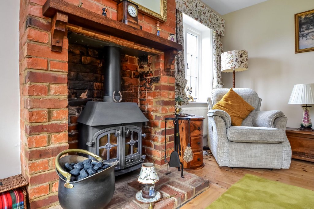 SITTING ROOM 16' 6" x 12' 1" (14'0" max) (5.03m x 3.68m) Double glazed window to front aspect overlooking veranda and gardens with radiator under, central exposed brick surround fireplace with matching hearth and log burner, double glazed window to side aspect with radiator under, stripped and stained floorboards, door leading to inner hallway.