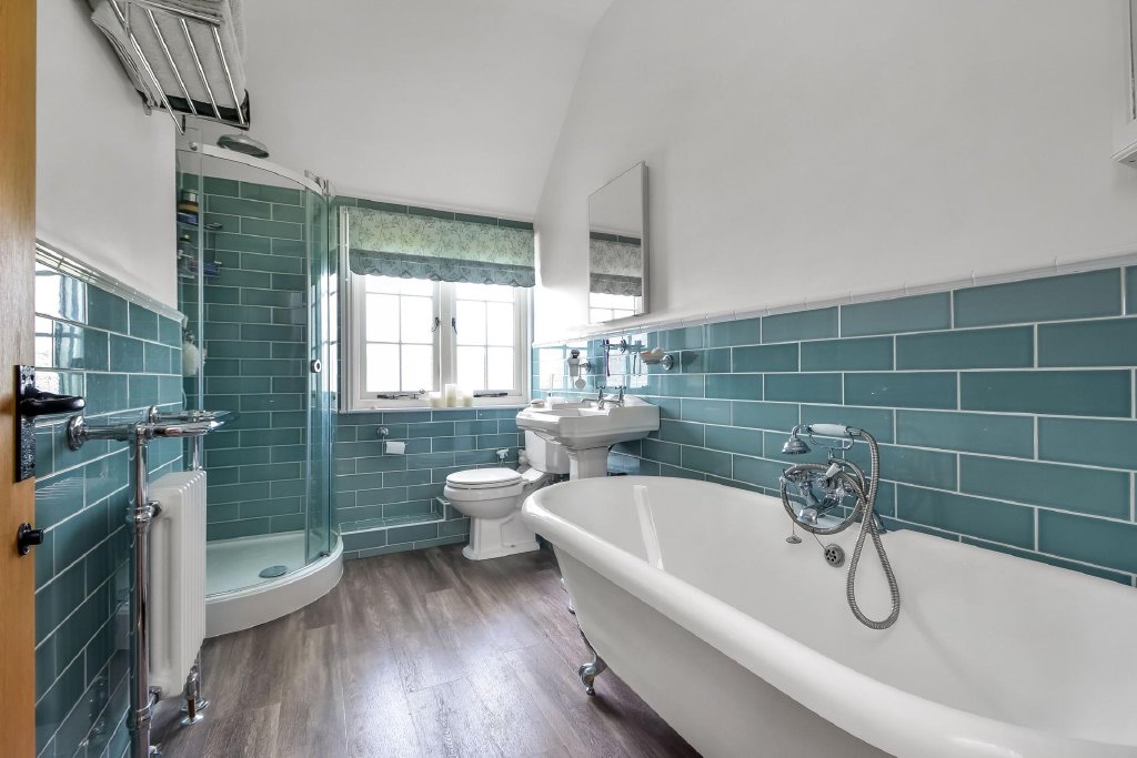 FEATURE BATHROOM 11' 0" x 6' 1" (3.35m x 1.85m) White suite comprising; low level w.c., pedestal wash hand basin, free standing double ended claw footed bath with telephone style chrome mixer tap and shower attachment, ceramic tiled to half wall level, radiator with heated towel rail over, corner shower cubicle with curved panelled door, drench style hood and separate shower attachment, double glazed frosted window to rear aspect, high ceiling with spotlights, extractor fan, ceiling rose.