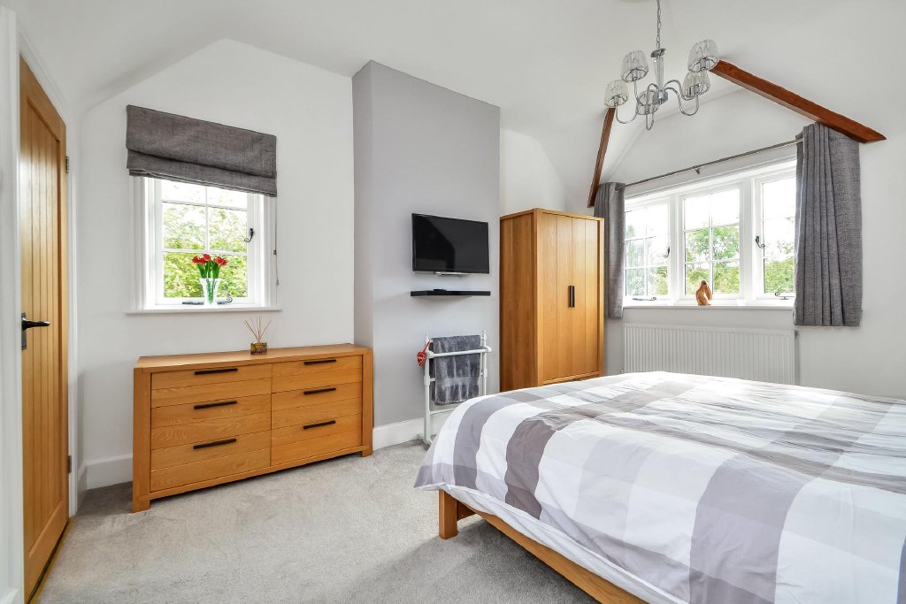 BEDROOM 2 14' 8" x 12' 2" (4.47m x 3.71m) Feature vaulted ceiling with some exposed beams and ceiling rose, narrow built-in storage cupboard, double glazed window to front aspect overlooking garden and woodland with radiator under, double glazed window to side aspect, T.V point, door to: