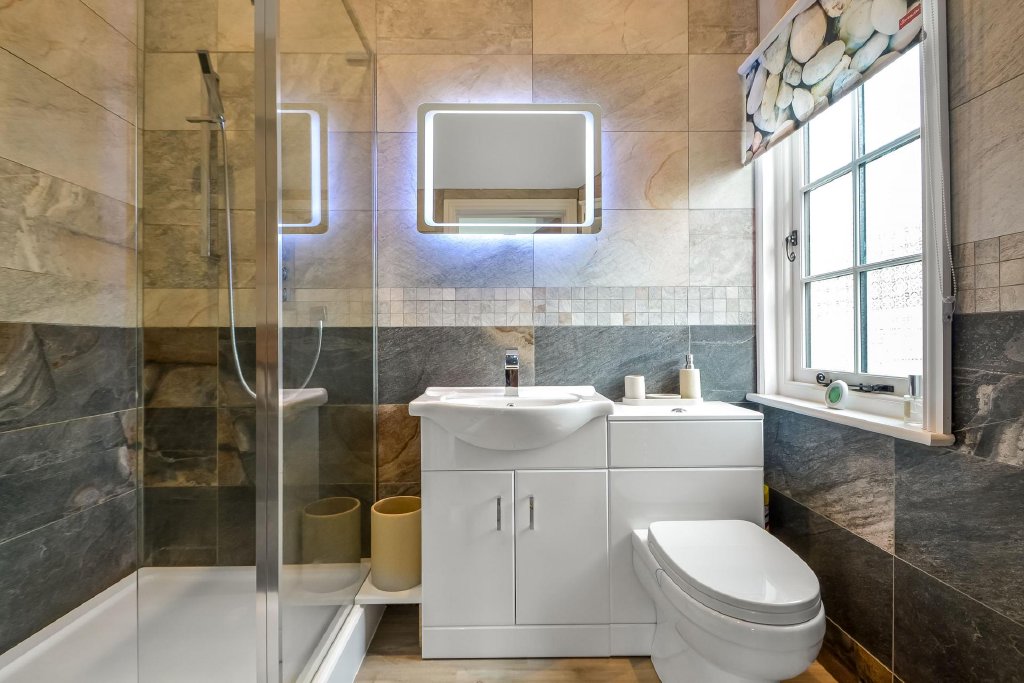SHOWER ROOM Fully ceramic tiled to walls and floor, wash hand basin with mixer tap and cupboards under, concealed cistern w.c., mirror and shelf over with oak wood surround, double glazed frosted window to side aspect, corner shower cubicle with curved panelled doors and Mira Sport shower, extractor fan, ceiling spotlights, chrome heated towel rail.