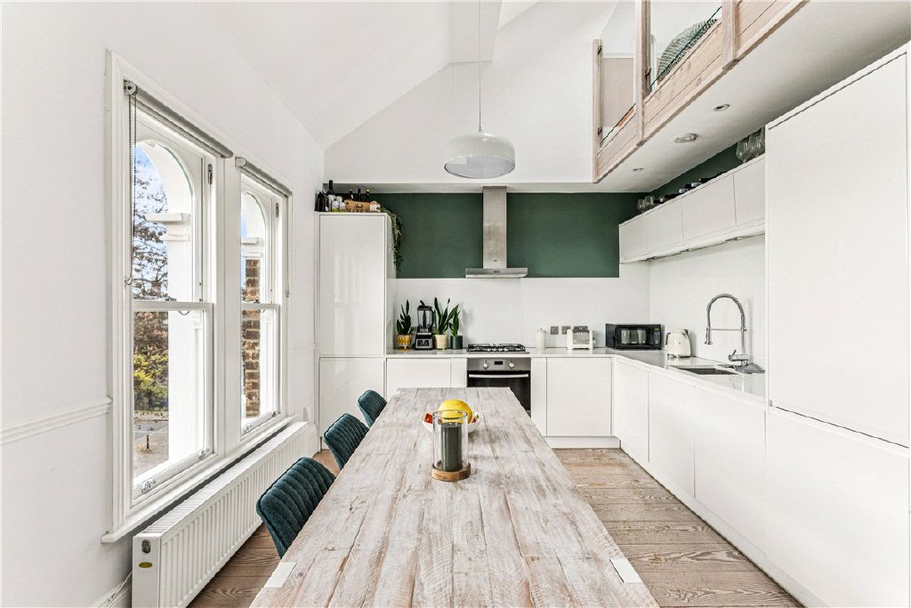 Located on the second floor of an elegant Victorian building on Trinity Road, the apartment has a bright open plan kitchen/diner with large double-glazed sash windows and skylights that flood the living space with light. Contemporary white cabinetry provides a sleek look to the kitchen, with integrated appliances and plenty of room for a large dining table. The living room area is on a mezzanine level, and also benefits from natural light, provided from the floor-to-ceiling bifold doors and a Juliette balcony which frames the stunning views towards the City. Pale wooden flooring runs throughout both living spaces.
