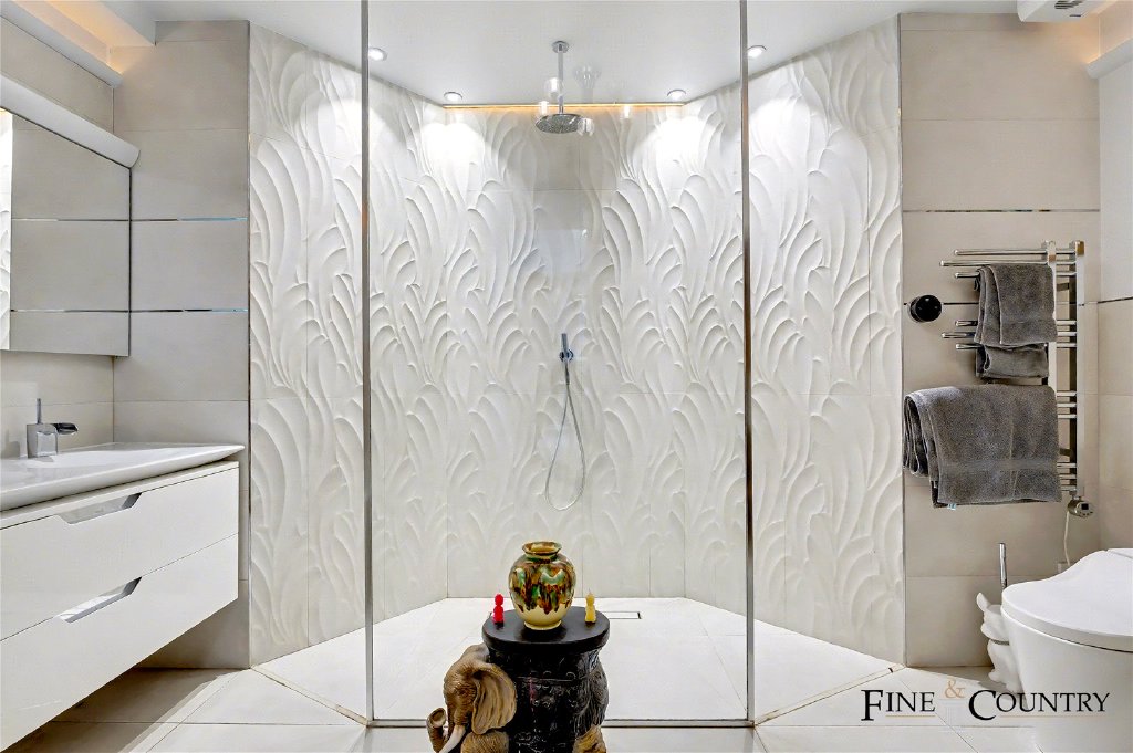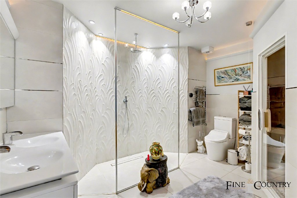 The lower level unfolds as an unexpectedly generous and private sleeping wing, designed with a clear emphasis on comfort and wellbeing. The principal suite occupies the quietest position, opening directly onto a secluded terrace through full-height windows that introduce soft natural light throughout the day. A curved feature wall with inset lighting creates a subtle focal point above the bed, while polished flooring amplifies the sense of space and calm. Adjoining the bedroom, a bespoke dressing room offers extensive fitted storage in warm timber cabinetry, creating a dedicated, well-organised transition space. The luxurious en suite is finished with large-format tiling and a sculptural textured wall that adds depth and visual interest. A fully glazed, integrated sauna elevates the suite to spa-standard, complemented by a generous walk-in shower and twin vanity arrangement.