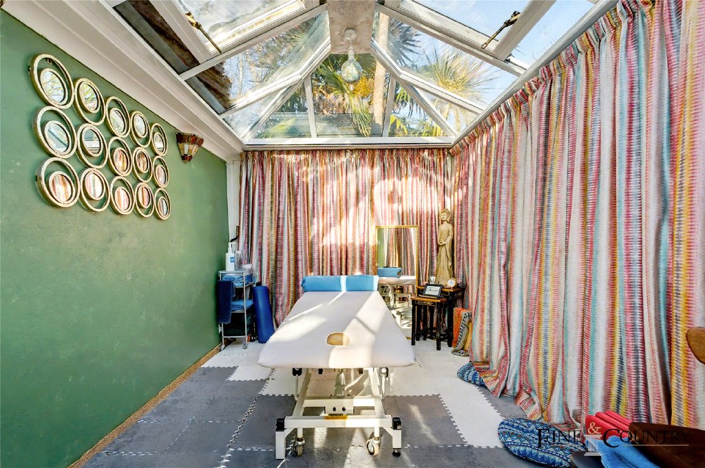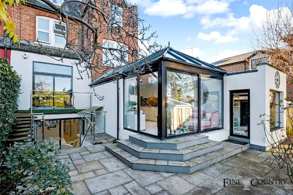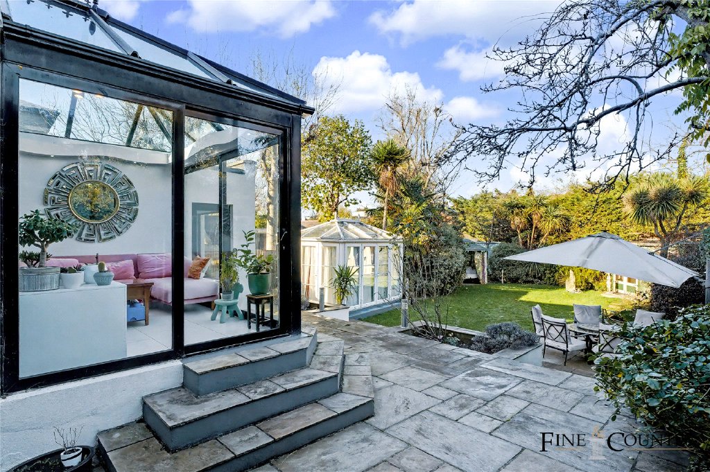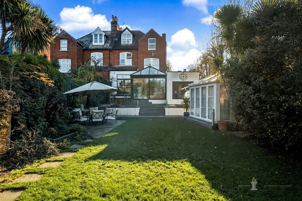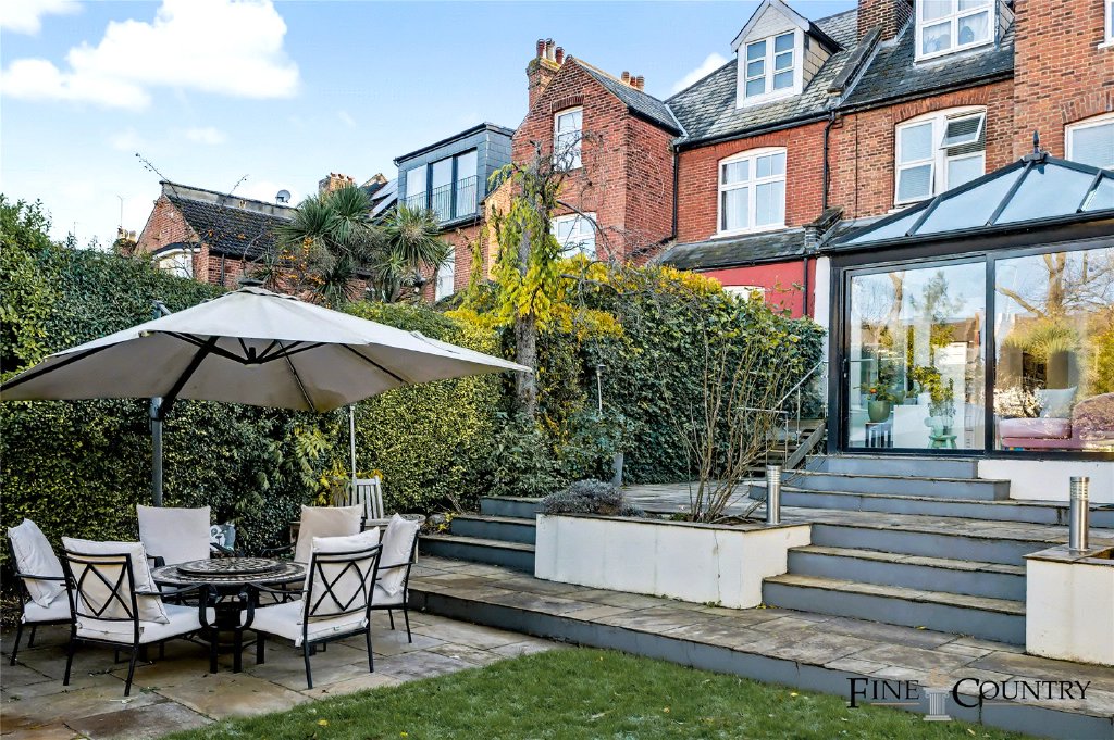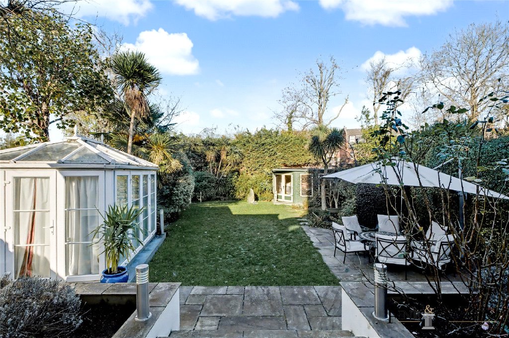 The 76-foot garden offers a generous stretch of level lawn bordered by mature hedging and established planting, creating excellent privacy and a lush, green outlook. A raised terrace outside the conservatory leads down to a lower paved seating area, providing two distinct spaces for outdoor dining and relaxation. To one side, a glazed garden room with a pitched roof offers flexible use throughout the year, while a summer house at the rear sits neatly among the trees, adding a further tranquil retreat within the garden.