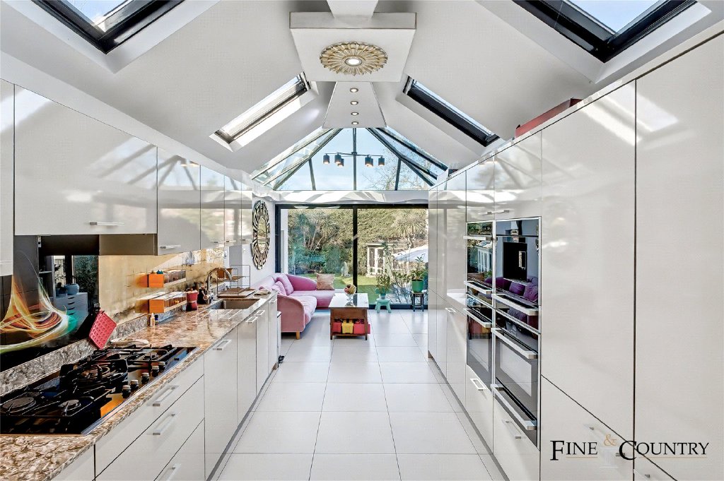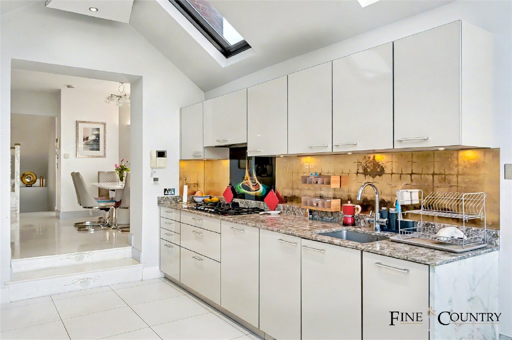 Leading through to the kitchen, the atmosphere shifts to a contemporary aesthetic defined by clean lines and a generous sense of volume. Gloss-finish cabinetry in a light, reflective tone runs the full length of the room, paired with granite worktops that introduce natural texture and depth. A metallic gold-toned splashback adds a subtle, mirrored luminosity, catching light from the vaulted ceiling above. The ceiling itself is fitted with multiple skylights, drawing daylight deep into the plan and enhancing the elongated perspective towards the garden.