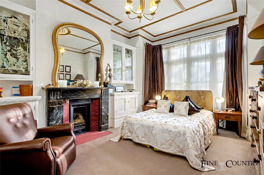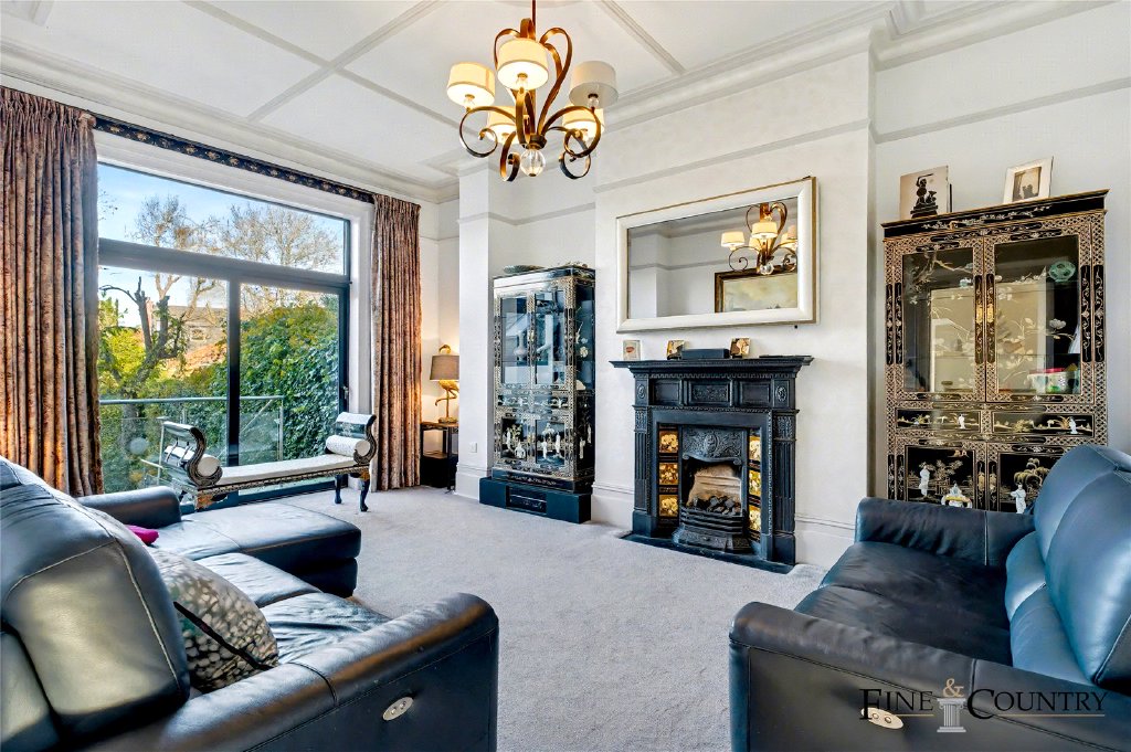 The ground floor unfolds with an elegant reception room positioned to the rear of the property, where period craftsmanship is immediately evident. A striking cast-iron fireplace forms the focal point, framed by detailed mantel carving and original tiled inserts. Decorative ceiling panelling and an ornate ceiling rose amplify the vertical proportions of the space, while the large sliding glass doors introduce a strong visual connection to the garden. Soft, neutral carpeting adds warmth and acoustic softness, balancing the formality of the architectural detailing and creating a refined yet comfortable living environment.