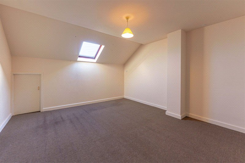A substantial double bedroom with front-facing views and a Velux rooflight, offering excellent natural light and generous floor area for furniture placement.