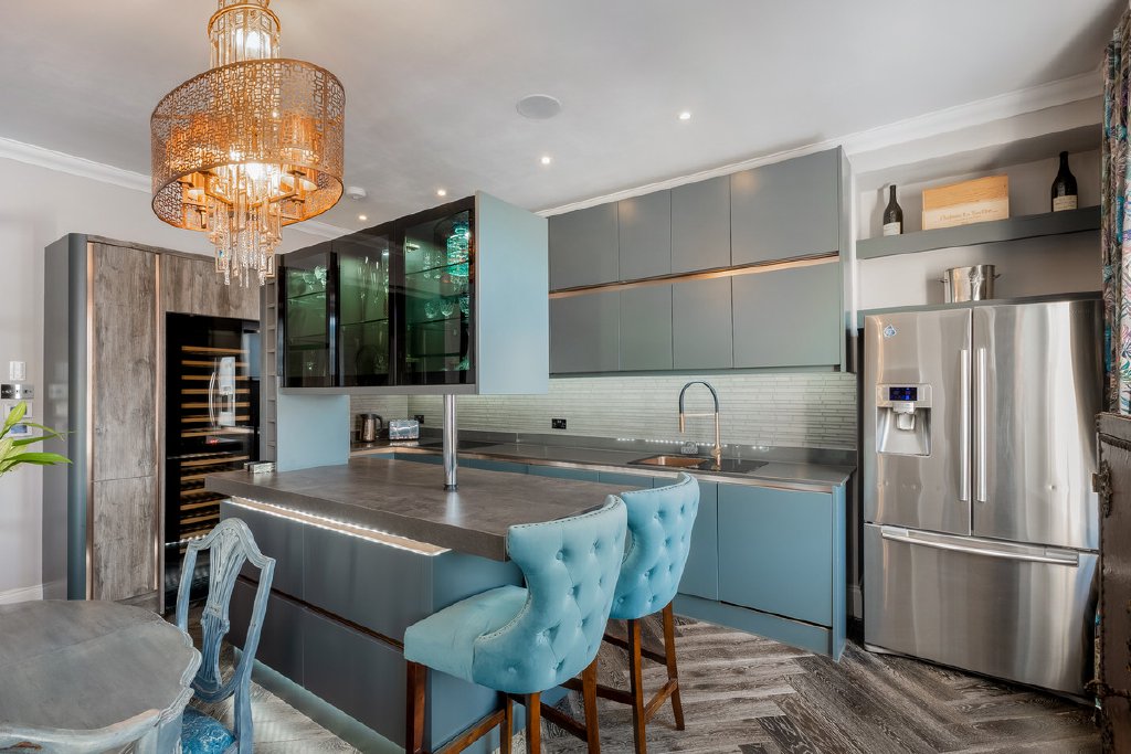 The bespoke kitchen is an impressive focal point, fitted with high-quality units, central island with breakfast bar seating, granite worksurfaces and a comprehensive range of integrated appliances including a dishwasher, substantial wine cooler, washer/dryer, integrated refuse system and ambient mood lighting.