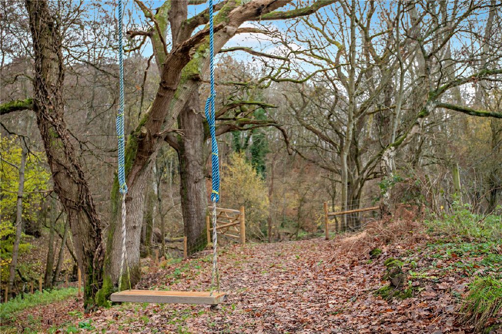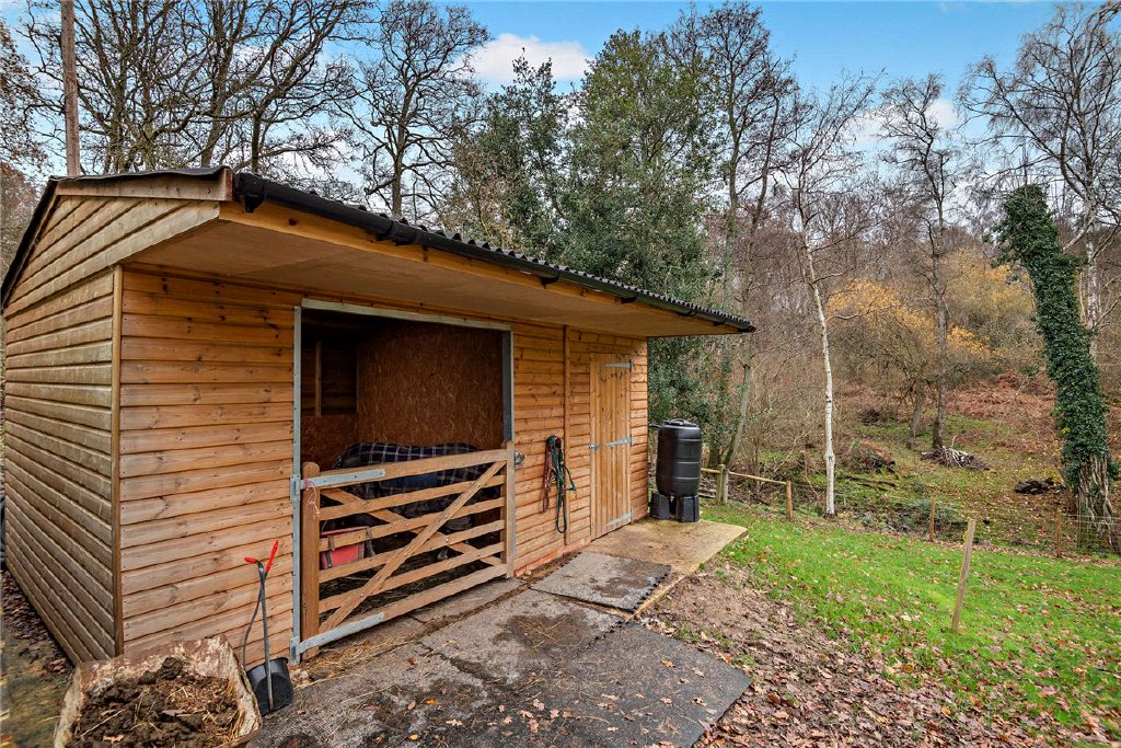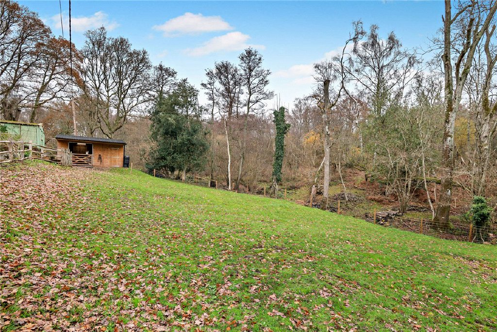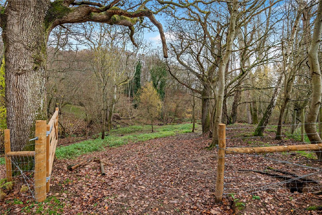 The property is approached over Crookham Common and entered via wooden double gates. There is a sizeable lawned garden that extends the recreation space and benefits from a drive, garage with EV charger, shed and timber store. To the rear there is a southerly facing garden with expansive patio area overlooking the adjoining fields with a large, quality bespoke timber built summerhouse. A real feature of the property is the land which measures over 2 acres and is made up of part paddock land with a stable and the beautiful woodland.