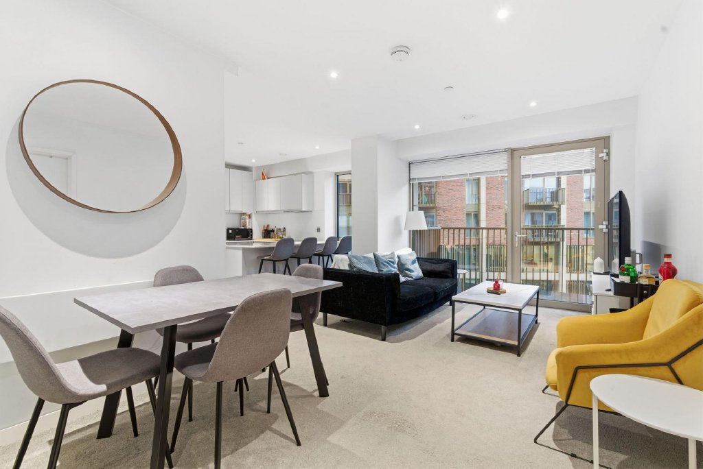 The apartment opens into a bright, open-plan living space where a modern fitted kitchen with integrated appliances sits alongside a comfortable lounge and dining area. Large windows allow natural light to pour in while offering attractive views across the surrounding cityscape, with a private balcony extending the living space outdoors that’s perfect for morning coffee or evening downtime.