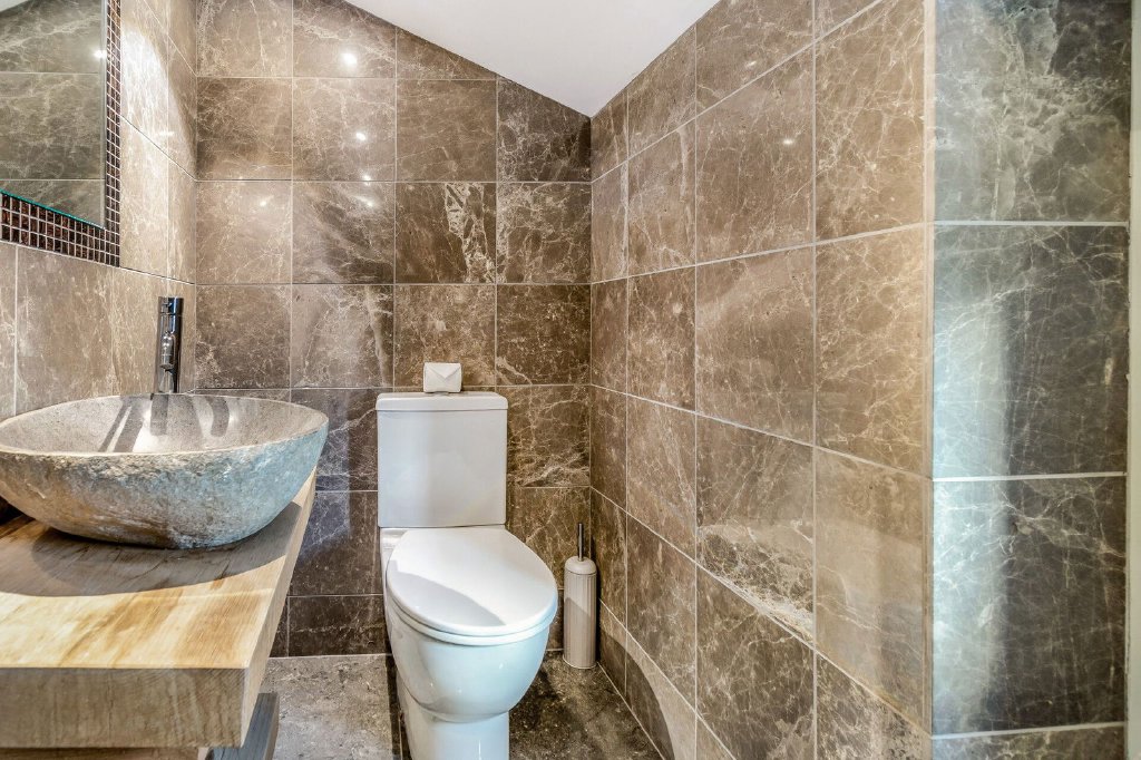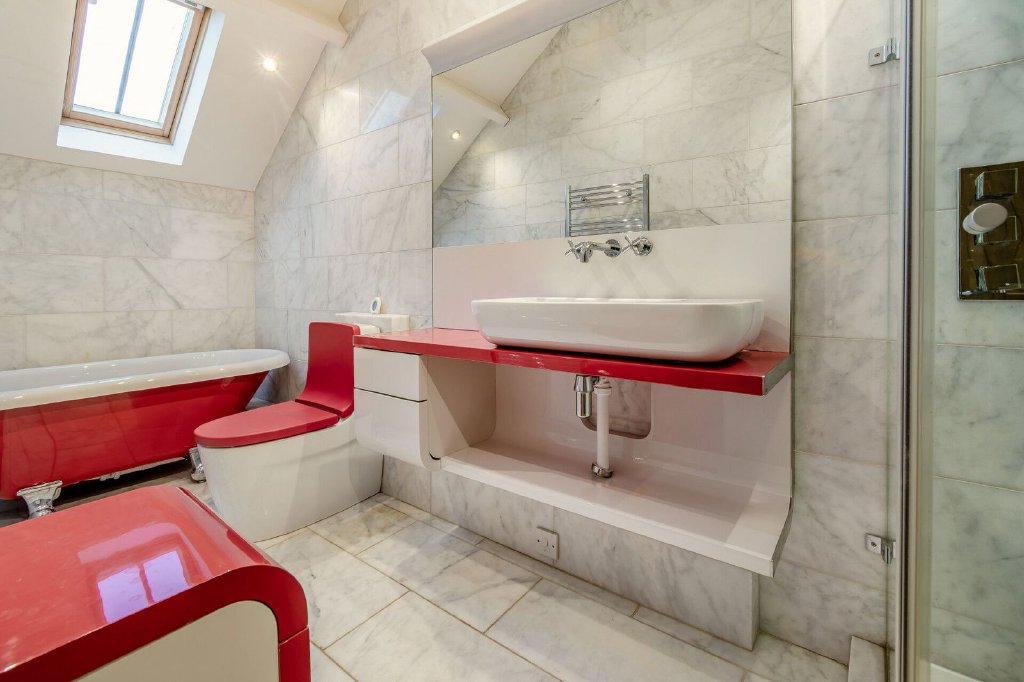The family bathroom is presented with a four piece suite consisting of a roll top bath, a low flush W.C, a wash hand basin with vanity drawers beneath and a shower with fixed glass screens. The room has complementary marble tiling to the walls and floor, a heated Chrome towel rail and a Velux skylight window.