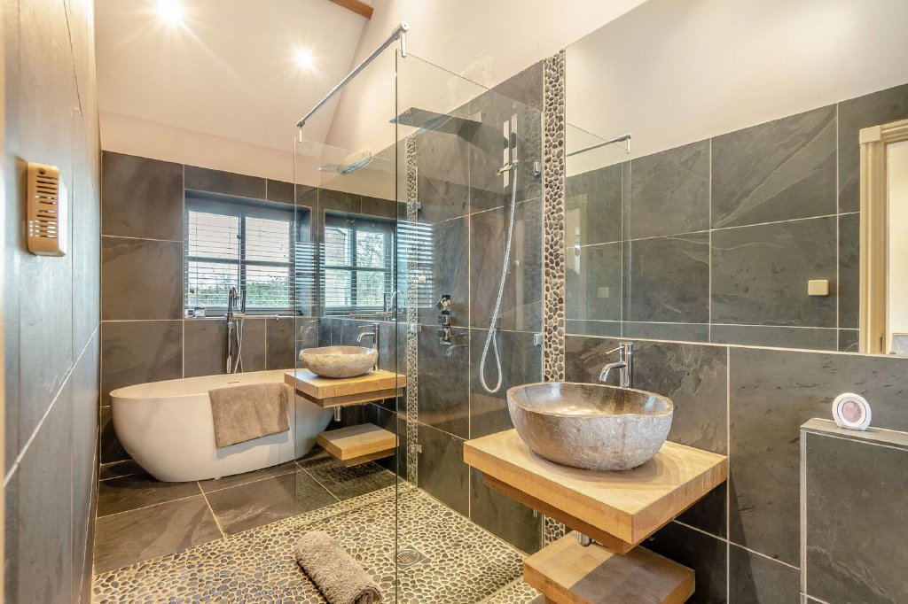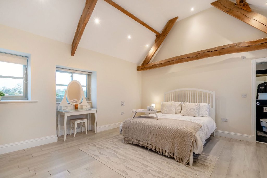 The principal bedroom suite has a walk through dressing room with a vaulted ceiling, windows to front and rear aspects whilst the bedroom itself offers exceptional accommodation, flooded with natural light, windows to front and rear aspects, each commanding impressive views over the grounds and adjoining scenery beyond. This room displays exposed trusses into the apex of the ceiling and gains access to an en-suite bathroom presented with a freestanding, double ended bath, twin carved stone wash hand basins each sitting on a stone plinth, a wet room style shower and a wall hung W.C; the room having complementary tiling to the walls and floor, windows to two aspects and a vaulted ceiling.