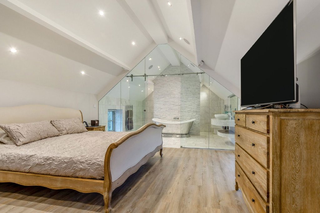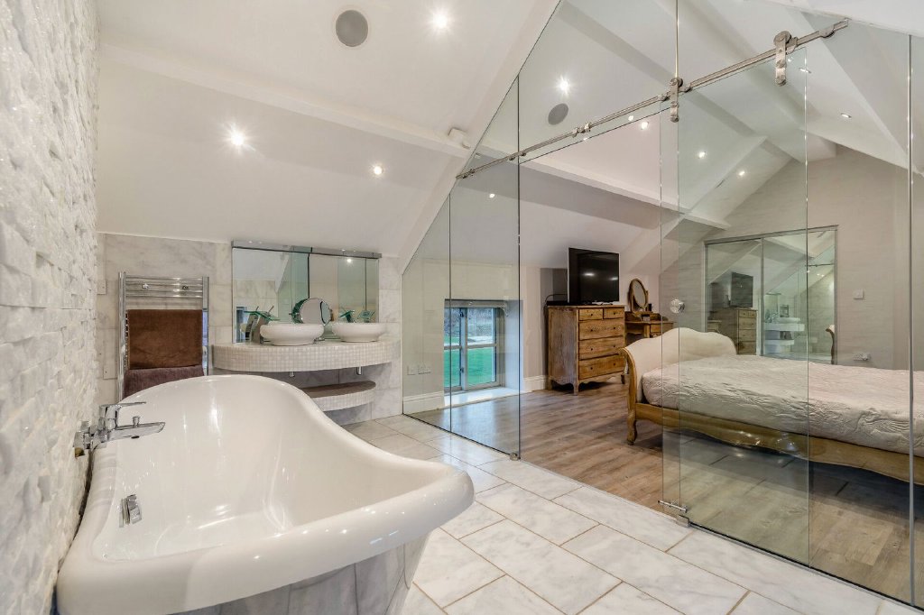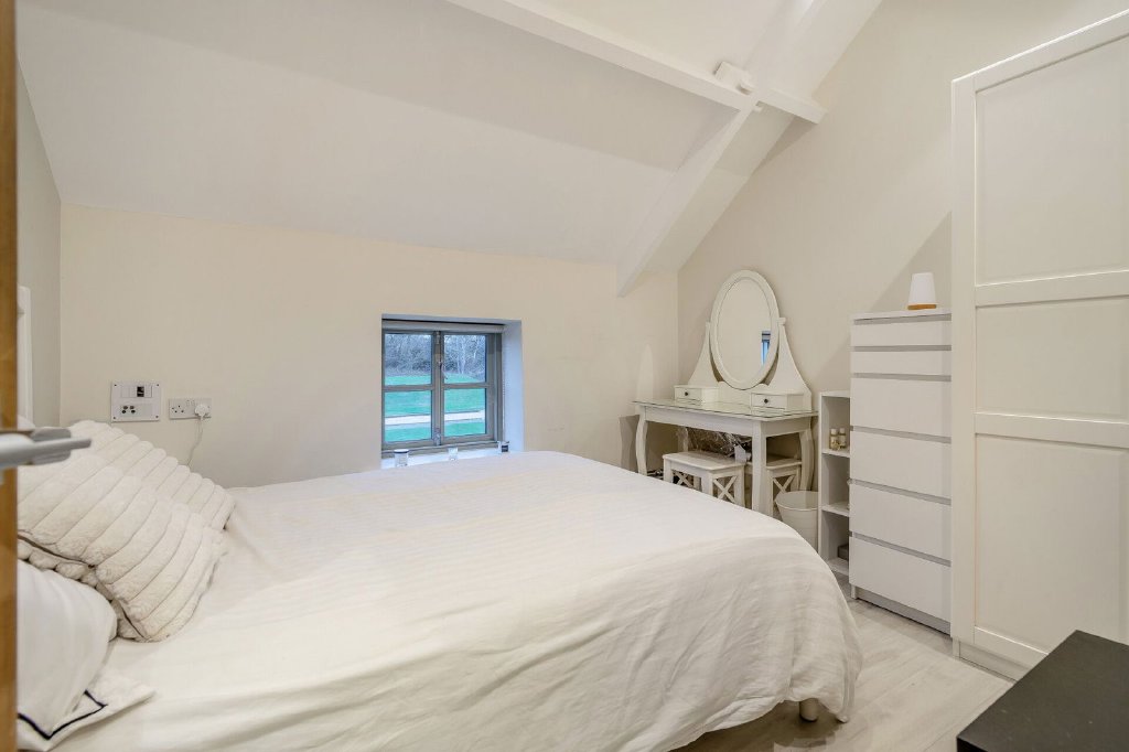 The second bedroom suite is impressive, the accommodation sympathetically blending tradition with contemporary design, the room having exposed beams to a vaulted ceiling, windows to two aspects and a walk-in dressing room with mirror fronted sliding doors. A glass wall with a sliding door opens into a stunning en-suite bathroom that has a free standing, roll top bath, twin wash hand basins, a bidet and concealed W.C. There is a wet room style, walk-in shower, the room complemented by marble tiling to the walls and floor whilst a window overlooks front aspect.