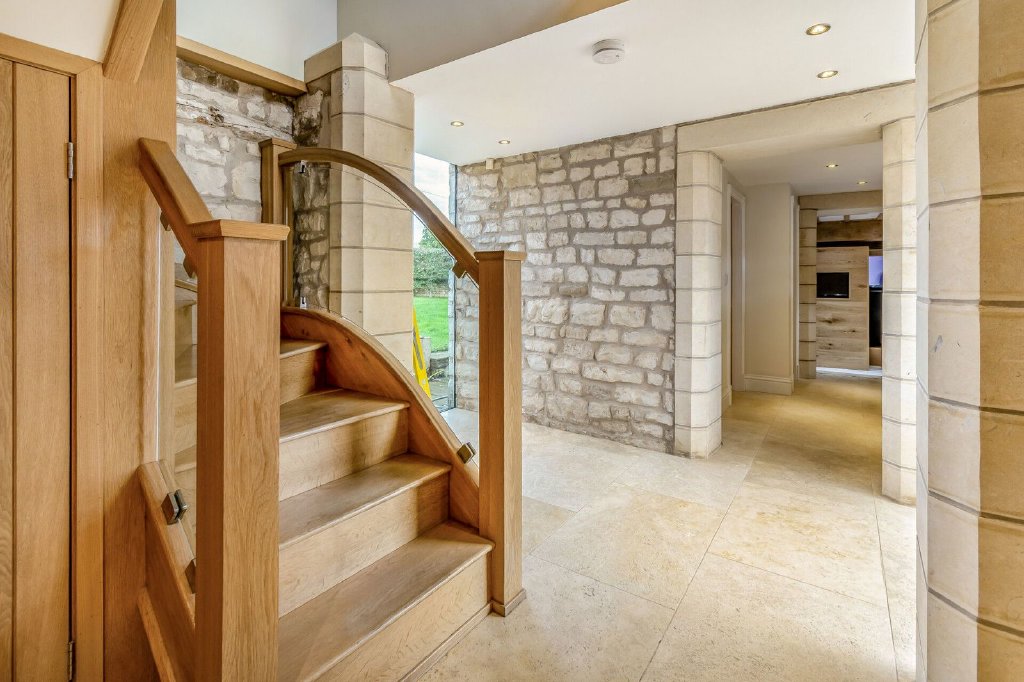 An entrance door from the courtyard opens to a reception hall which has full height windows to front and rear aspects, exposed stonework and a bespoke oak and glass staircase to the first floor level. A cloakroom is presented with a two piece suite and access is gained to both the living room and home cinema.