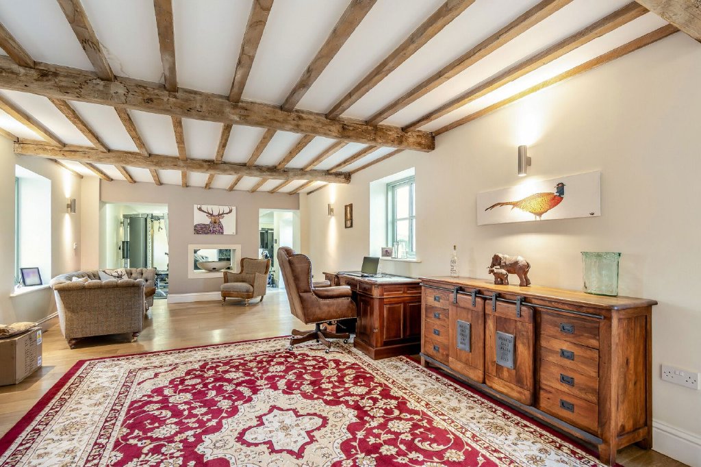 The living room offers exceptional accommodation with a wide solid oak entrance door opening to the front aspect of the home; a spacious room with windows to two aspects resulting in exceptional levels of natural light, the rear commanding a delightful outlook over the gardens, whilst twin doors open onto a stone flagged terrace. The room displays original beams and joists to the ceiling, has steps leading up to the living kitchen whilst a double sided chimney breast generates a natural divide to the gym an inset gas fire.