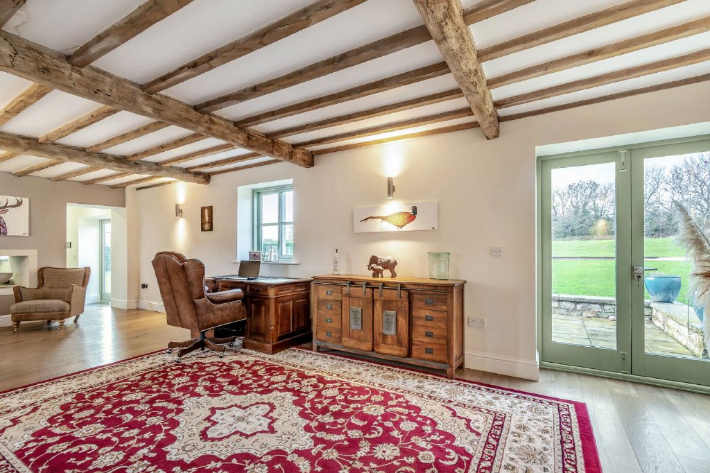 The home cinema has original exposed beams and trusses to the ceiling, a personal door to the garden and twin doors to the courtyard.