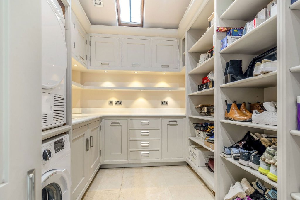 A utility presents cupboards and open fronted shelving to three walls, a work surface incorporating a sink unit and plumbing for both an automatic washing machine and a dryer.
