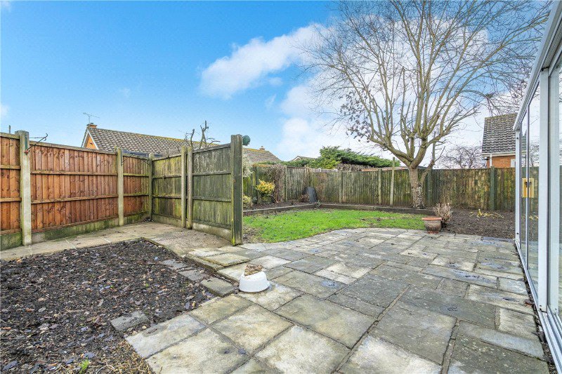 Externally, the property benefits from a pleasant enclosed rear garden, mainly laid to patio and lawn with established borders, providing a manageable yet enjoyable outdoor space. To the front, the bungalow enjoys an open aspect with a lawned garden and off-road parking nearby.