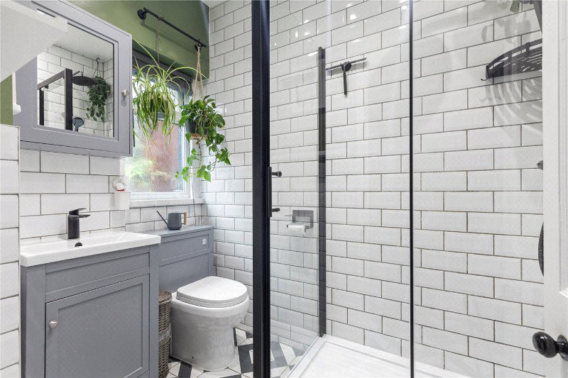 To the rear, a modern shower room is beautifully finished with metro tiles, monochrome patterned flooring, and sleek fittings, complemented by natural light. The property also benefits from a landscaped private garden, featuring a decked seating area, low-maintenance artificial lawn, and ample space for relaxing or entertaining guests.