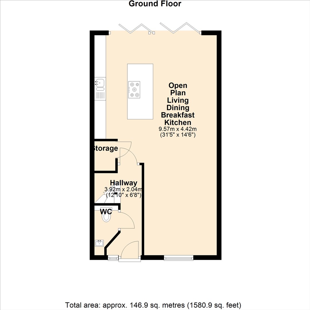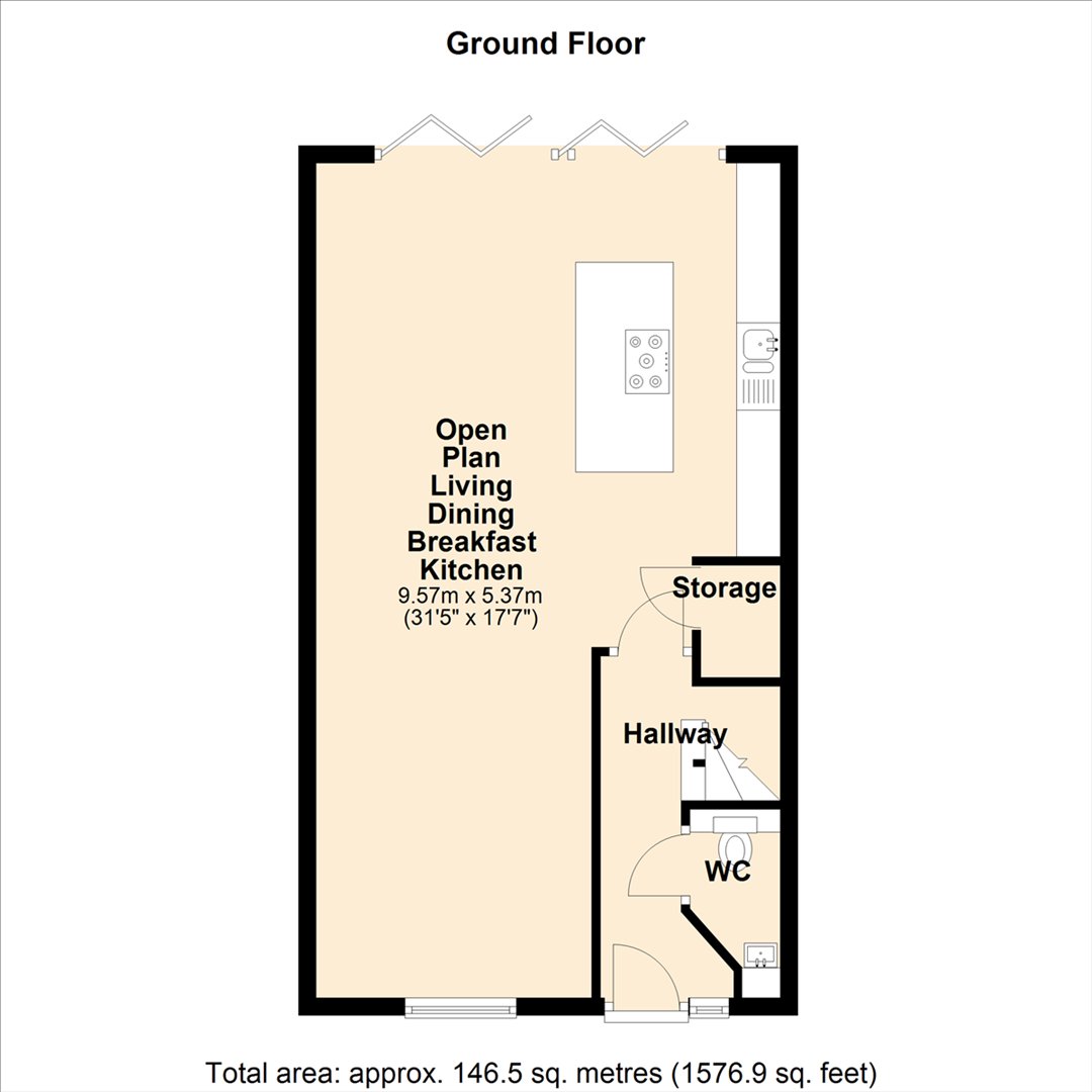 Open Plan Living Dining Breakfast Kitchen - 9.57m x 4.42m (31'5" x 14'6") - Window to front, two bi-fold doors, door to:
