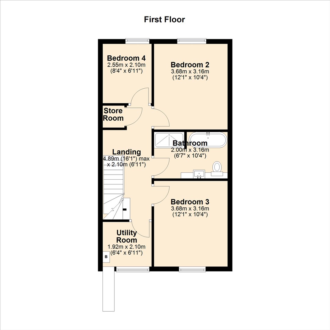 Landing - 4.89m x 2.10m (16'1" x 6'11") - Stairs, door to: