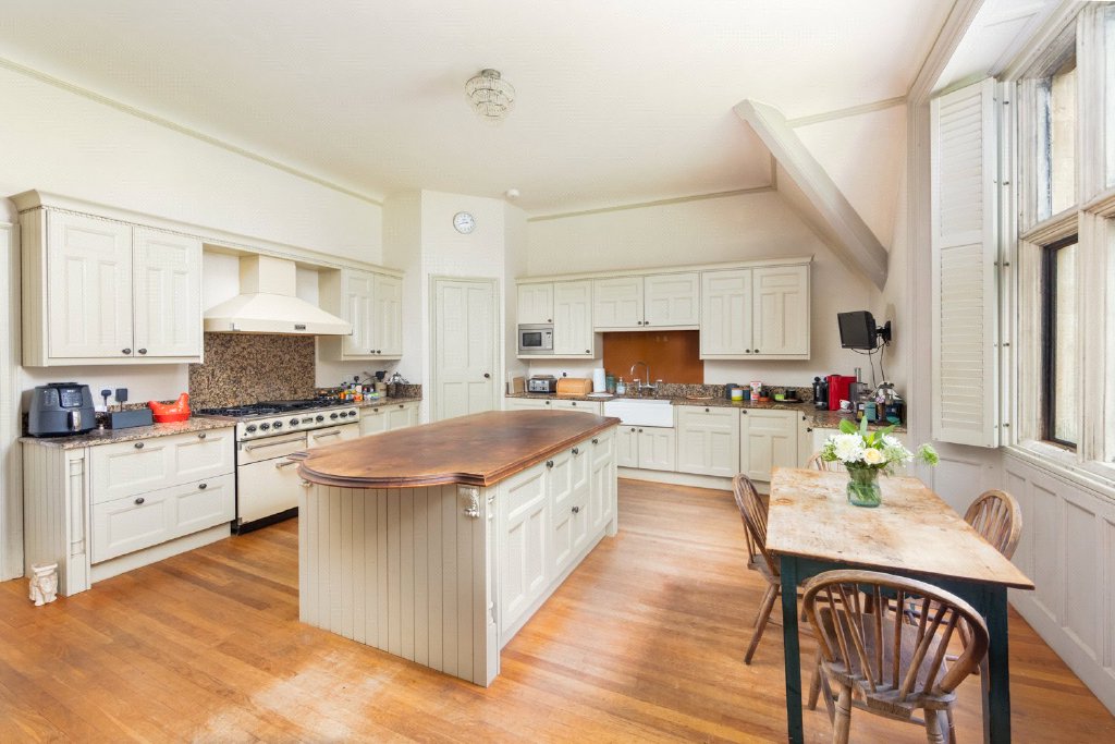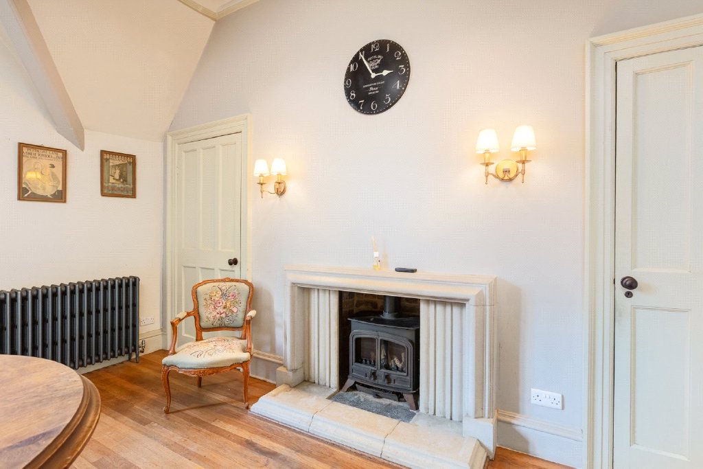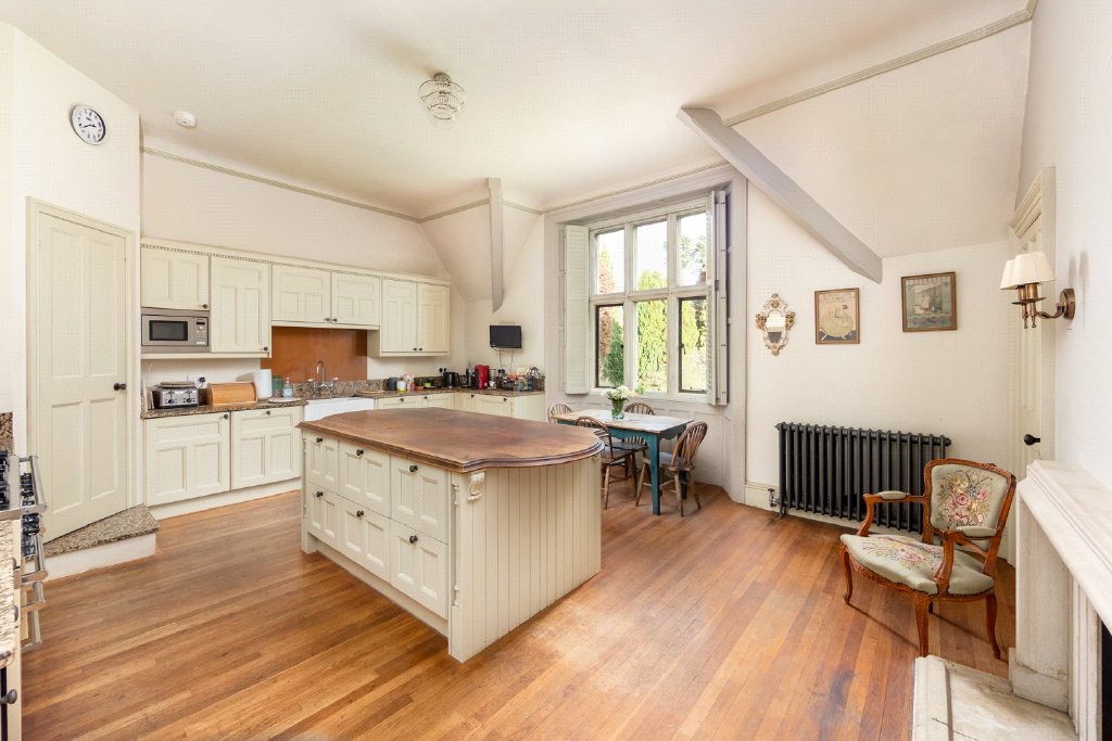 The first floor is arranged around a spacious kitchen/dining room, perfectly positioned to make the most of the bay window with its outlook over the gardens and beyond. The kitchen features a range of units and a central island, while the room itself enjoys wonderful character and a real sense of space, complemented by a fireplace (not currently in use).