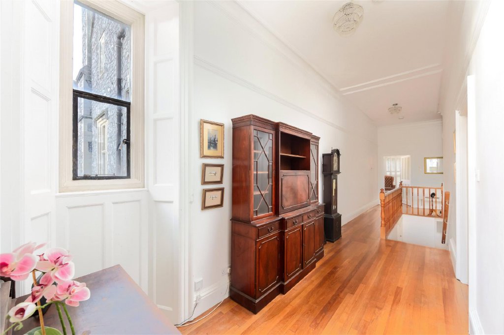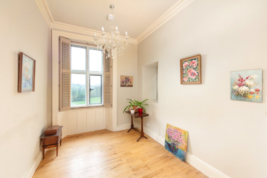 The generous sitting room also benefits from a large bay window framing the far-reaching views, along with a working fireplace — the ideal room to relax, enhanced by high ceilings and an abundance of natural light. Also on this floor is a study, together with two bedrooms. One features an en-suite shower room, while the other has use of the beautifully appointed family bathroom, complete with separate shower enclosure and a roll-top bath.