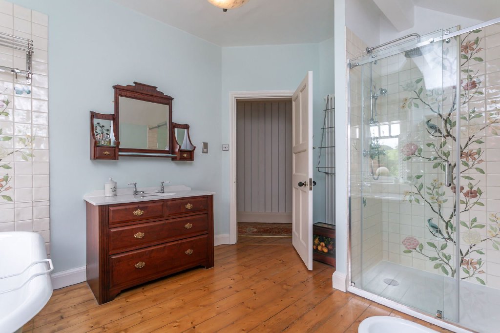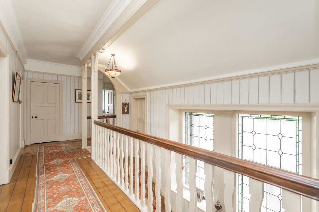 Built in 1911, the Edwardian era of domestic architectural is renowned for well proportioned rooms, the high ceilings and tall windows making light and airy interiors with highly practical and functional layouts that remain easy to occupy and manage. There is a lighter touch to decorative detailing than in the preceding Victorian age, with an emphasis on quality and craftsmanship. This is beautifully demonstrated in Rushton House with the warm golden tones of the abundant pitch pine joinery (the impressive staircase, panel doors and polished floorboards), period fireplaces (there are open fires in the sitting and dining rooms and study), a substantial kitchen dresser, the original bell board (no longer in working order), leaded and stained glass (notable in the front and inner main doors), tiled floors, deep skirting boards, ceiling cornicing and picture rails. There’s plenty of storage around the house and a host of ancillary rooms adjacent to the kitchen which belong to a time when a team of staff would have been in service, these highly practical rooms are as useful today as they ever were.