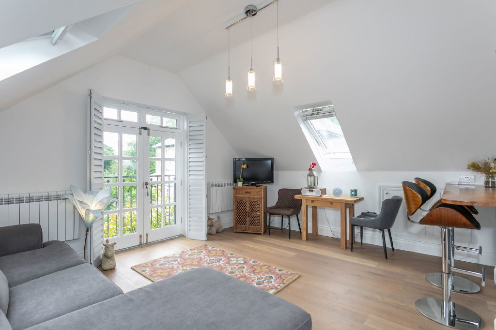 The impressive, detached garage was designed to echo the architectural style of the house. A pair of electric doors open to a space intended to potentially accommodate three cars with additional room at the back for a workshop. External steps lead to the first floor, here the self-contained studio flat is ideal for dependent relatives or guests who would appreciate a degree of independence from the main residence. It would also make a super home office for working free of distraction or as space to spread out and indulge a hobby. The main open plan room has a well equipped kitchen and depending on how you see this area being used, space for work stations or a sofa bed; French windows open to a Juliet balcony and the fabulous far reaching panoramic view beyond. The attractively appointed bathroom provides every convenience.