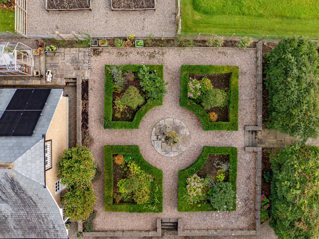 To the south sits a formal parterre garden laced with gravel paths, each quadrant featuring a clematis clad obelisk. The lawn is ideal for children’s play with several choices for garden seating with a large, flagged terrace accessed from the garden room and a verandah offering a covered option.